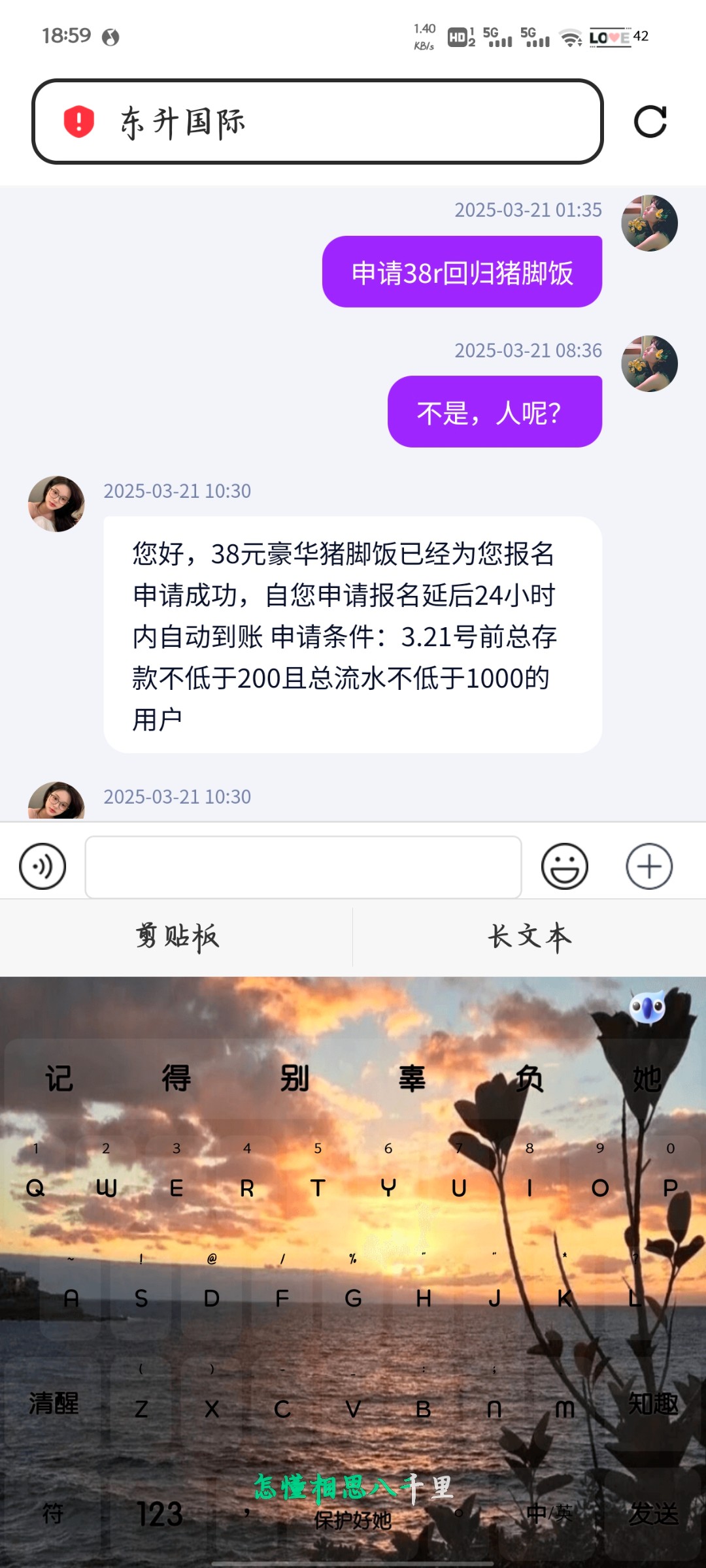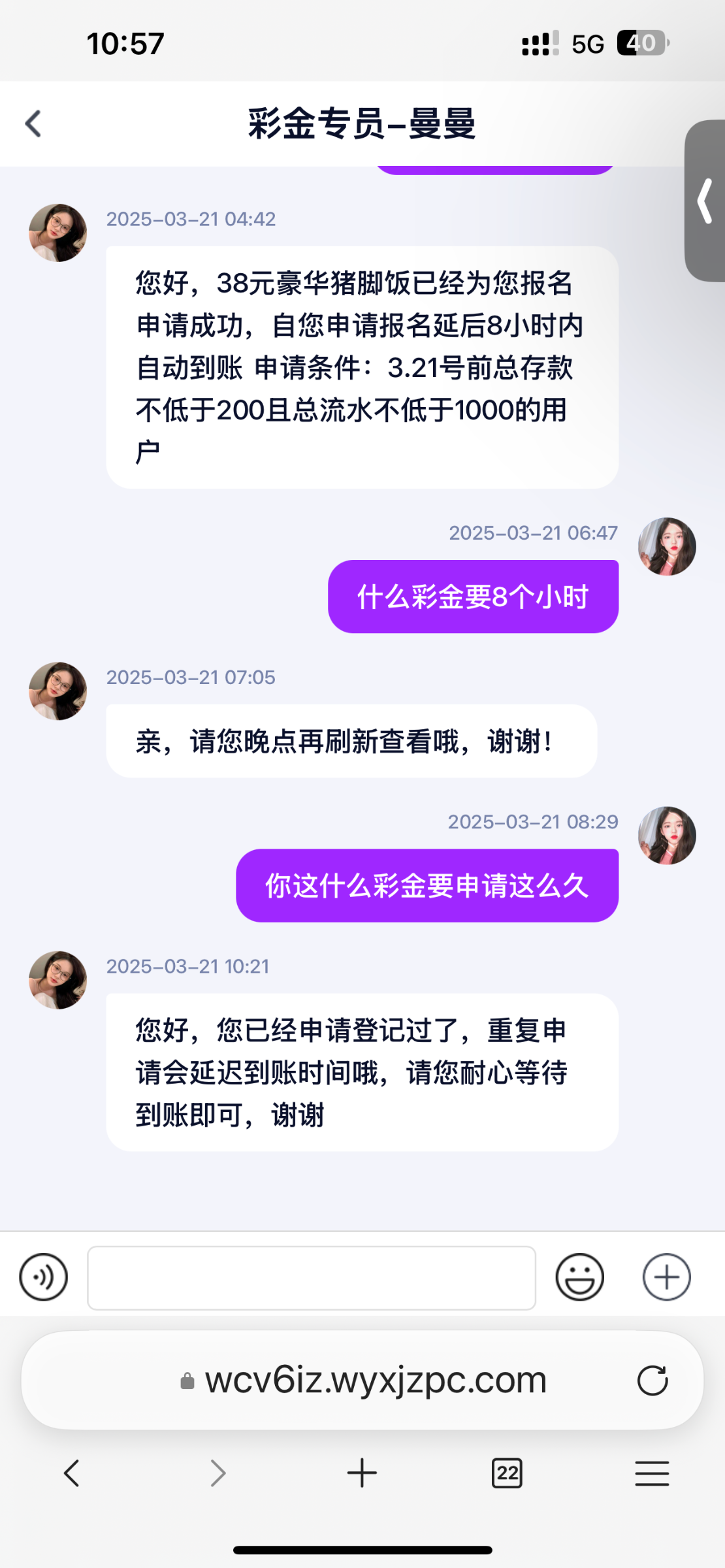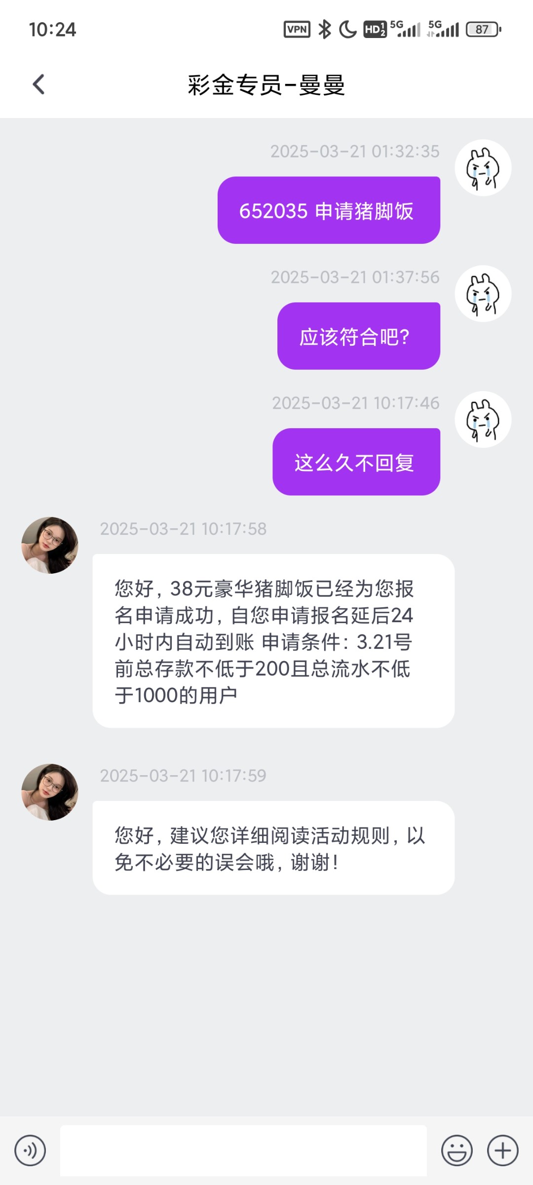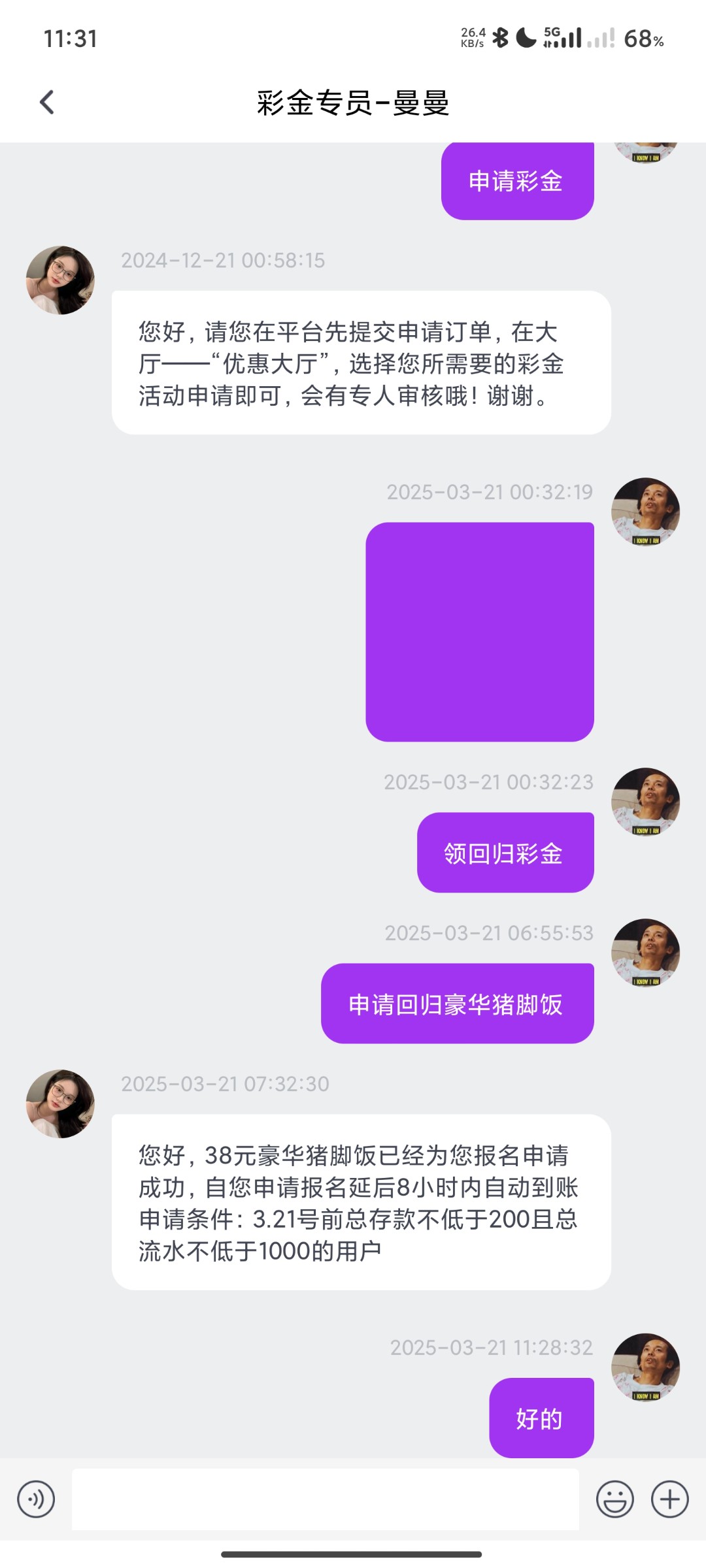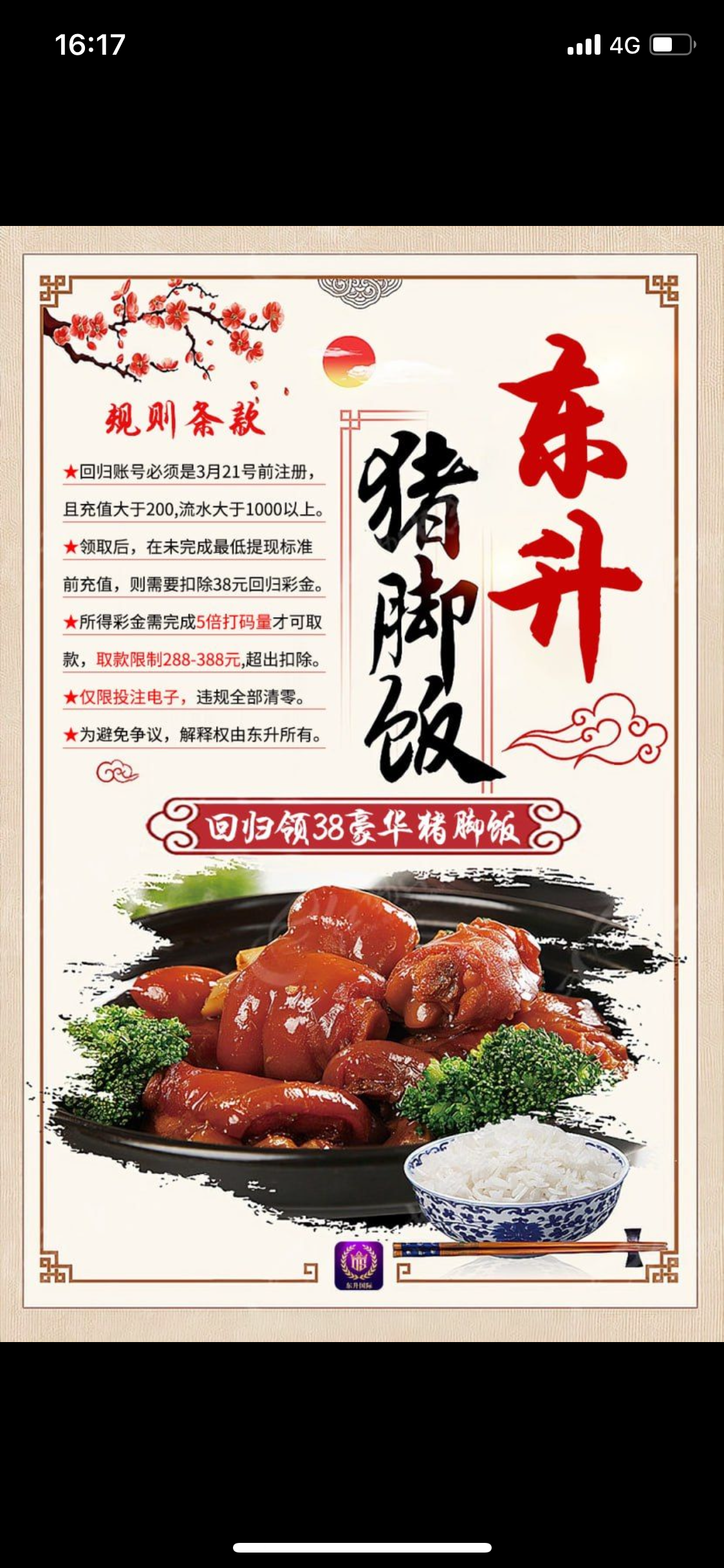 您好,38元豪华猪脚饭已经为您报名申请成功,早上4.00—6.00可自动到账 申请条件:3.21号前总存款不低于200且总流水不低于1000的用户