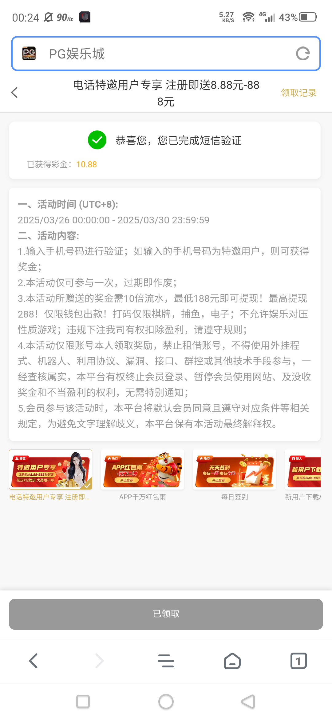 短信彩金 100pg.com 如果显示活动开始之后绑定才有效,直接去找个手机号修改就可以了,然后重新注册一个就可以领了