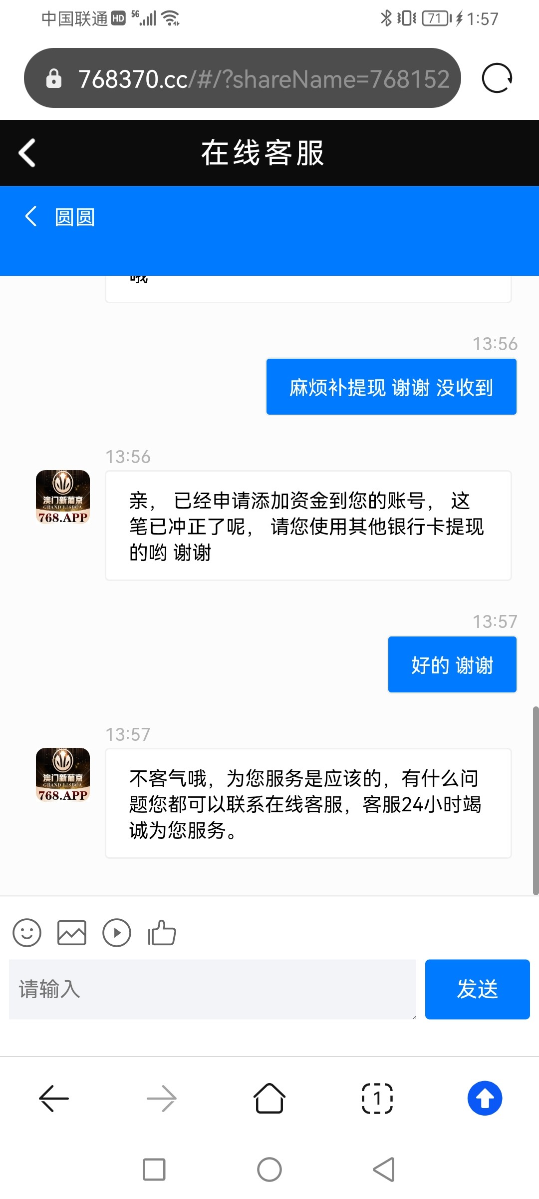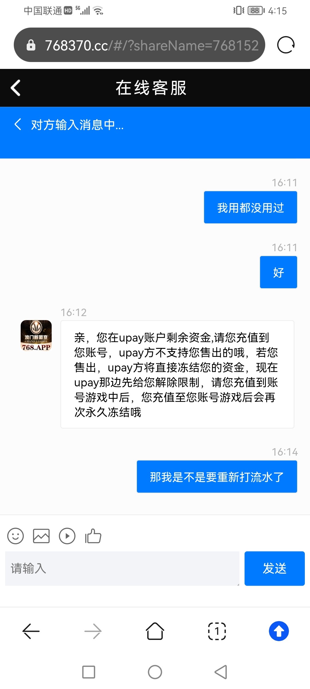 电话特邀送90 一天送18 五天送完 提现要充值100 红了180 提279 秒到 然后第二天去找客服说没到账 自己银行app录视频剪短中间不要的 结果成了 然后提u钱包 才发现以前u钱包p过图没成功封号了 找客服追回币 充回去 又要重新打流水 结果打输了 真是废物 白搞一下午