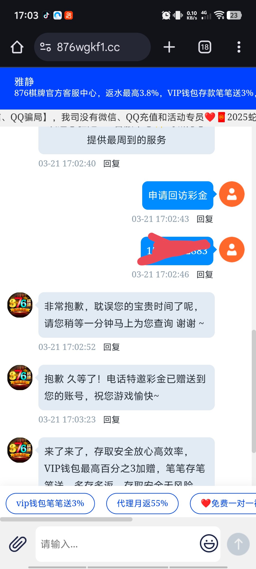 直接找客服申请回访彩金 回访18我没打出来 不截图了 有号的都去申请 地址 876.cc