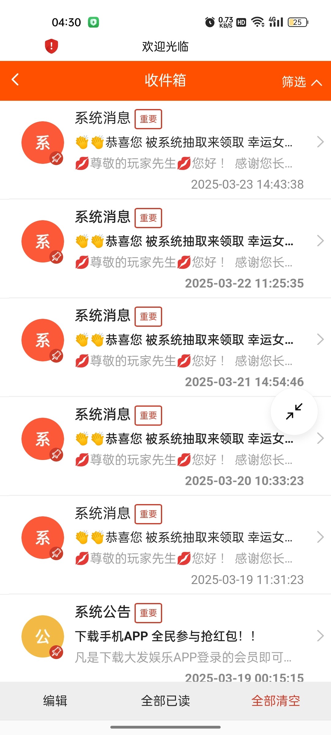 估计很久没登录的才有,我今年过年登录了领了彩金还了借呗,然后每个月登录按时还一下借呗,站内信毛都没