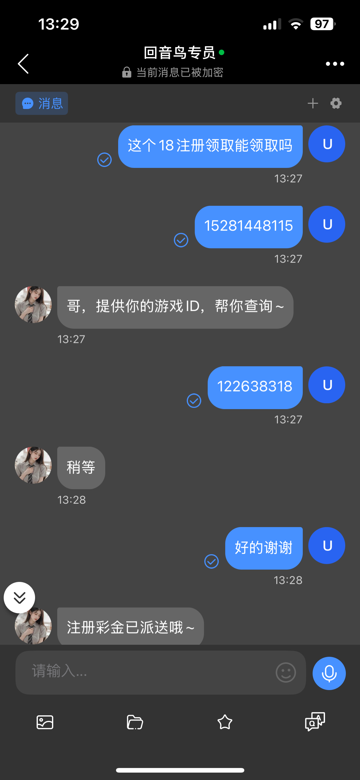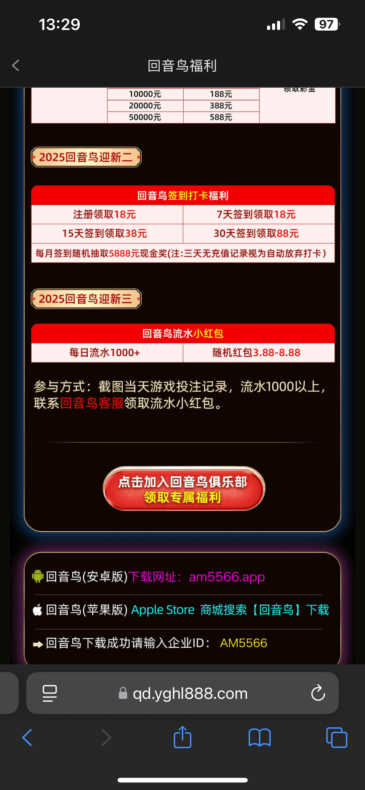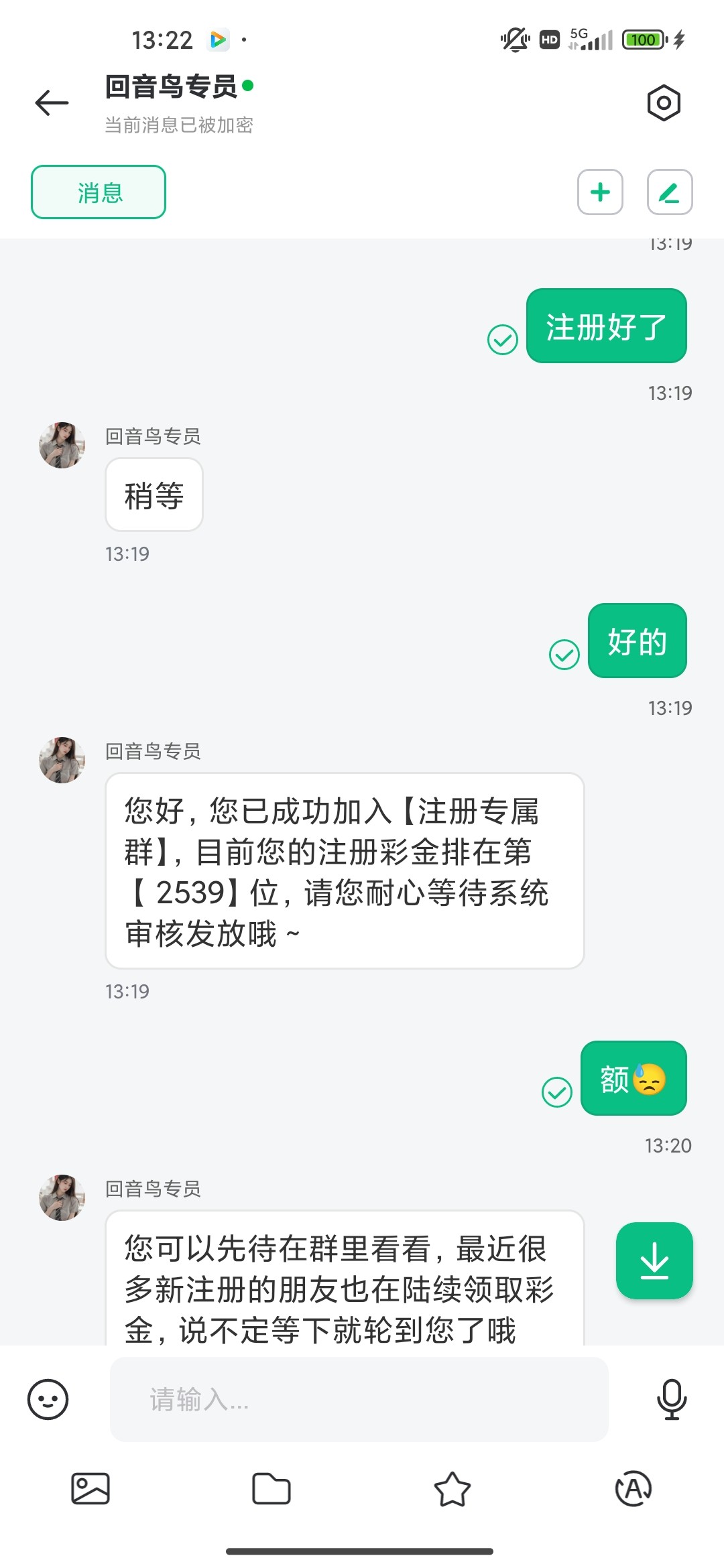 我是收到短信去的 注册绑定那个企业号自动添加 找回音鸟专员领取18注册彩金 回音鸟安卓下载地址:am5566.app 苹果直接在商店下载回音鸟 企业号AM5566 游戏链接: