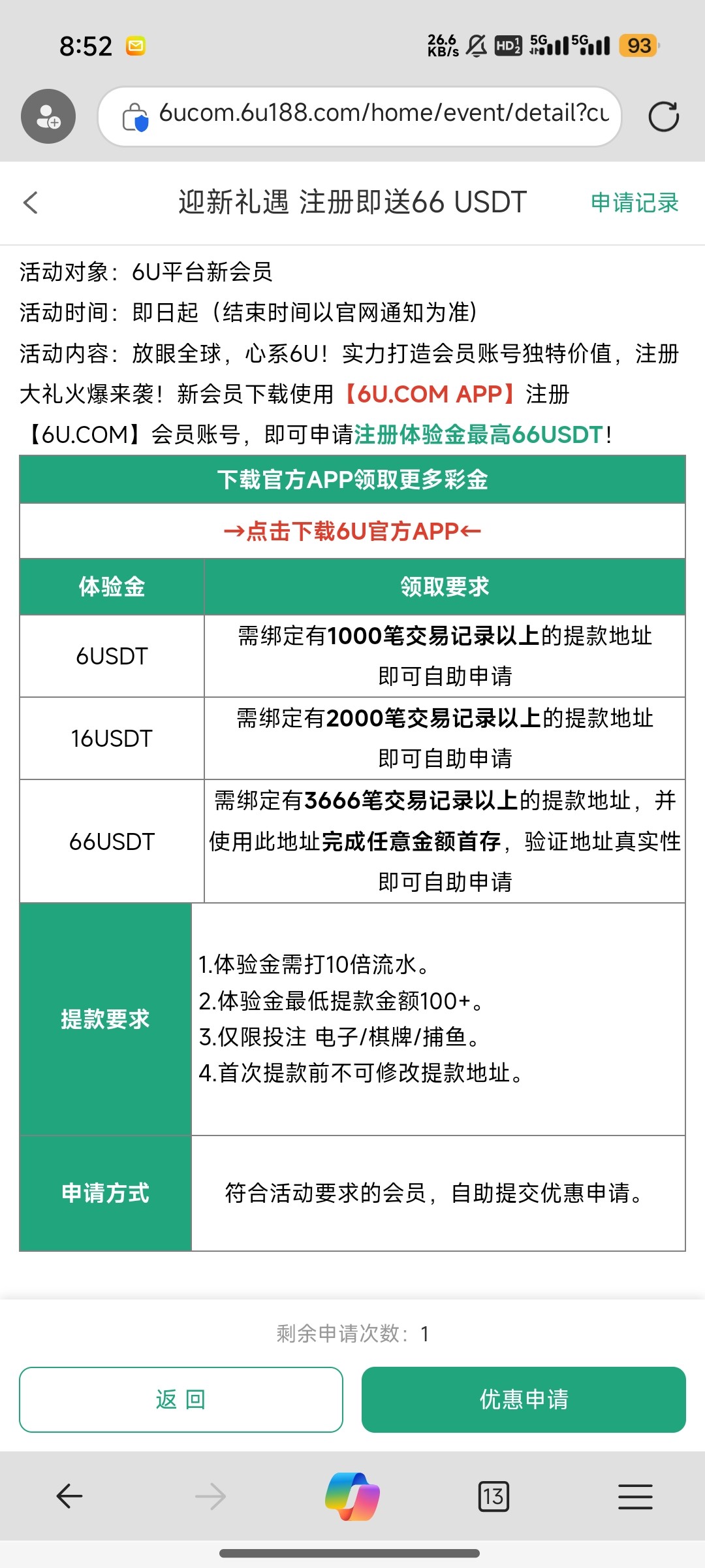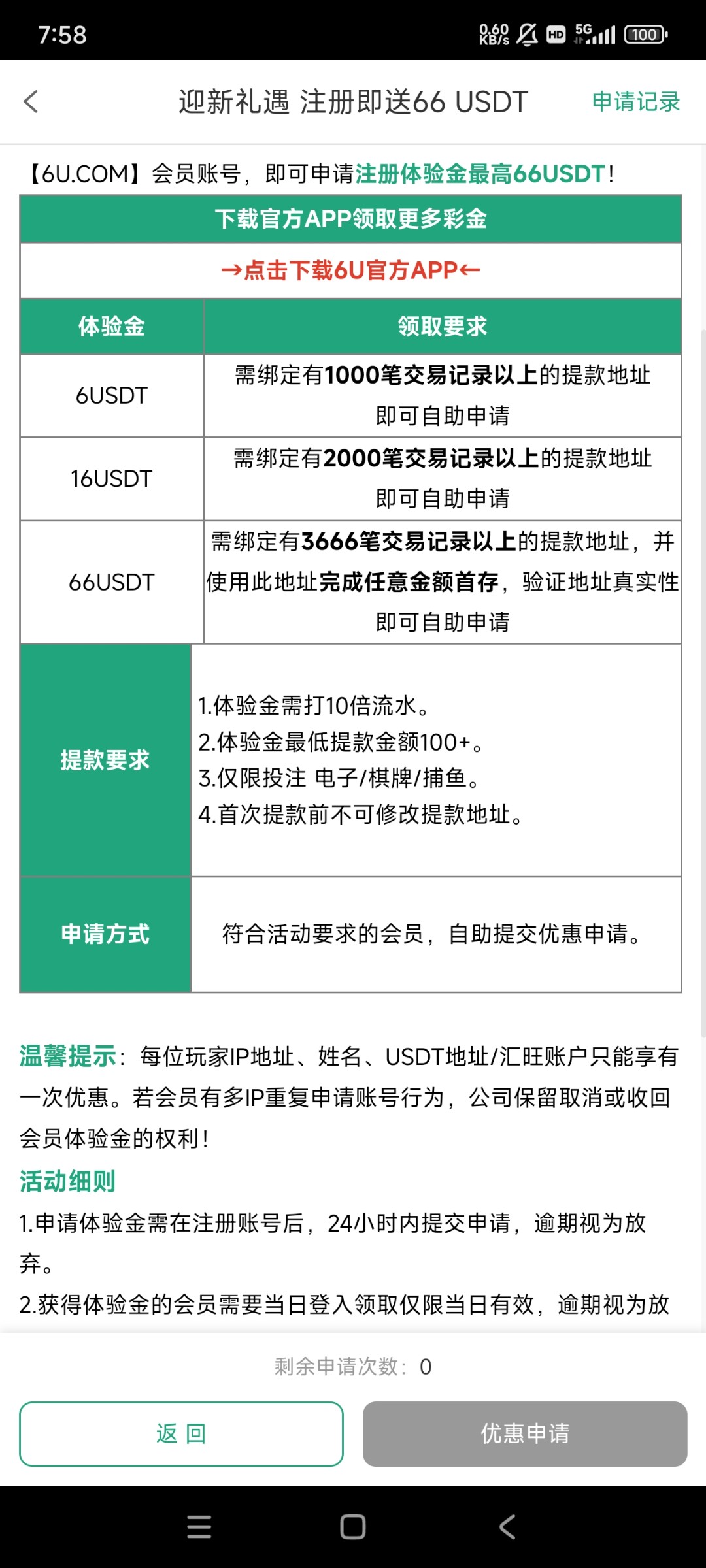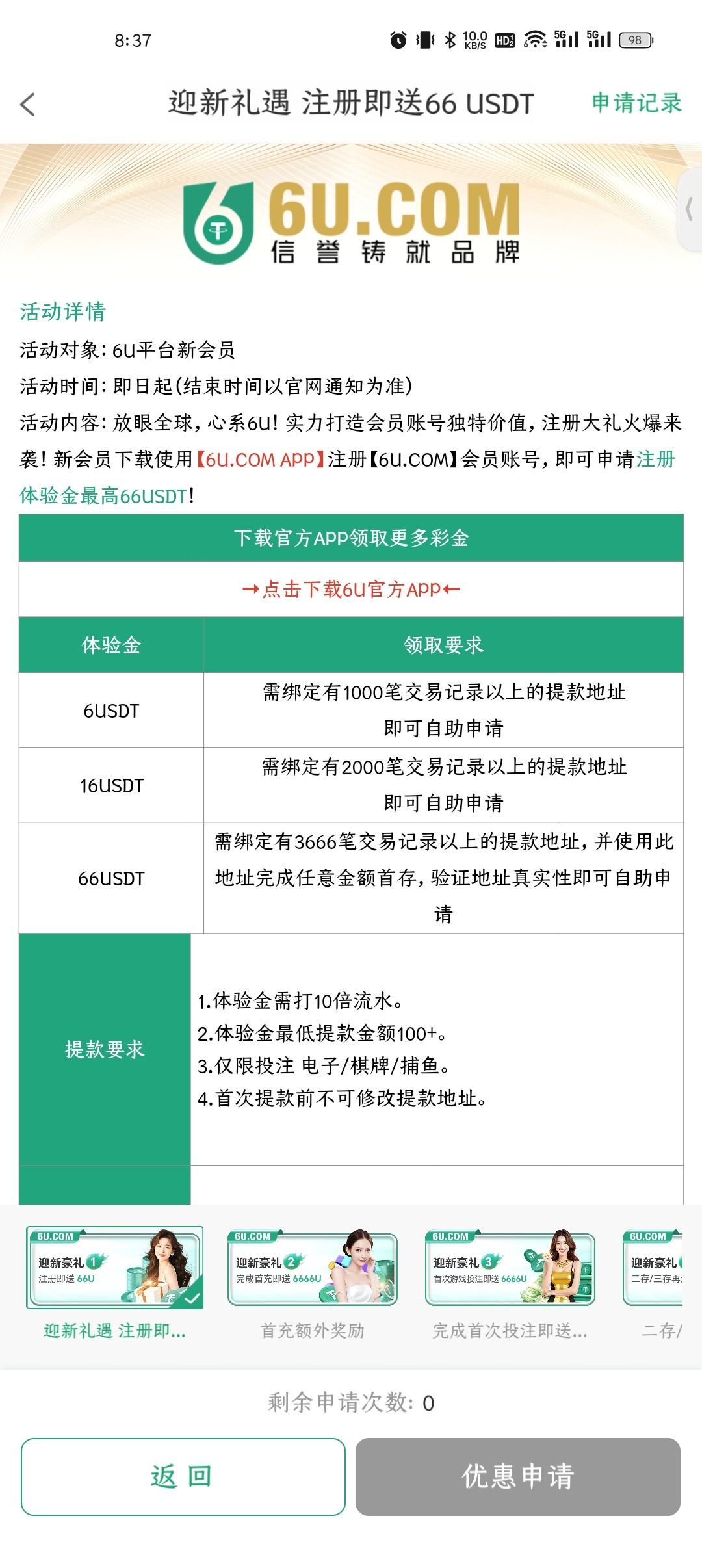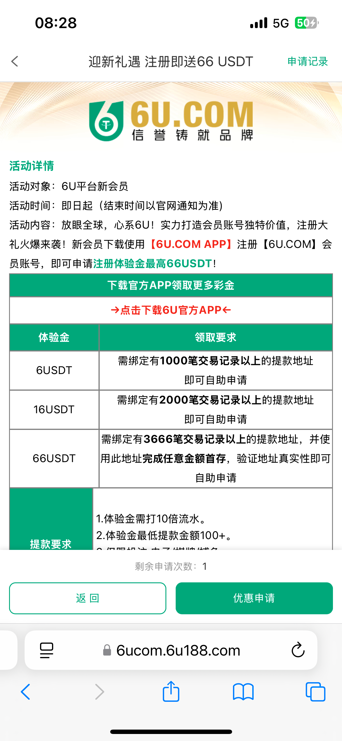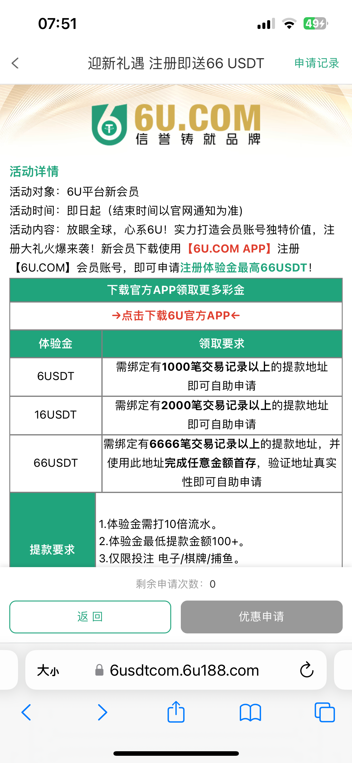我用的是狗庄钱包地址,申请不知道会不会通过,我没有活跃的U地址