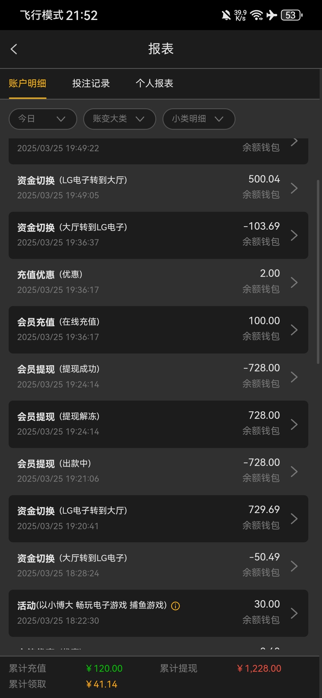 我打的老板棋牌,3339,6678,51棋牌,047,77pg,每天182的成本,047和77pg我从今天开始就不玩了,什么几把台,每次打到260多点,死活上不去,换游戏也不行,昨天047打到265给我吃完,77pg打到250多给我吃完,这两个台子杀还控分