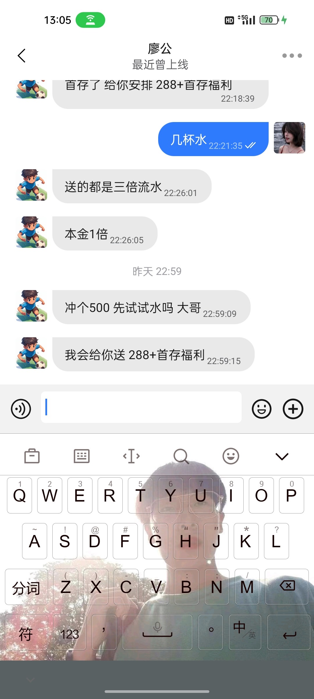 昨天晚上加我微信,给我平移了v5等级,还说送我288,结果都搞完了让我充值,我看了下活动是最低300,包赔150,能不能上