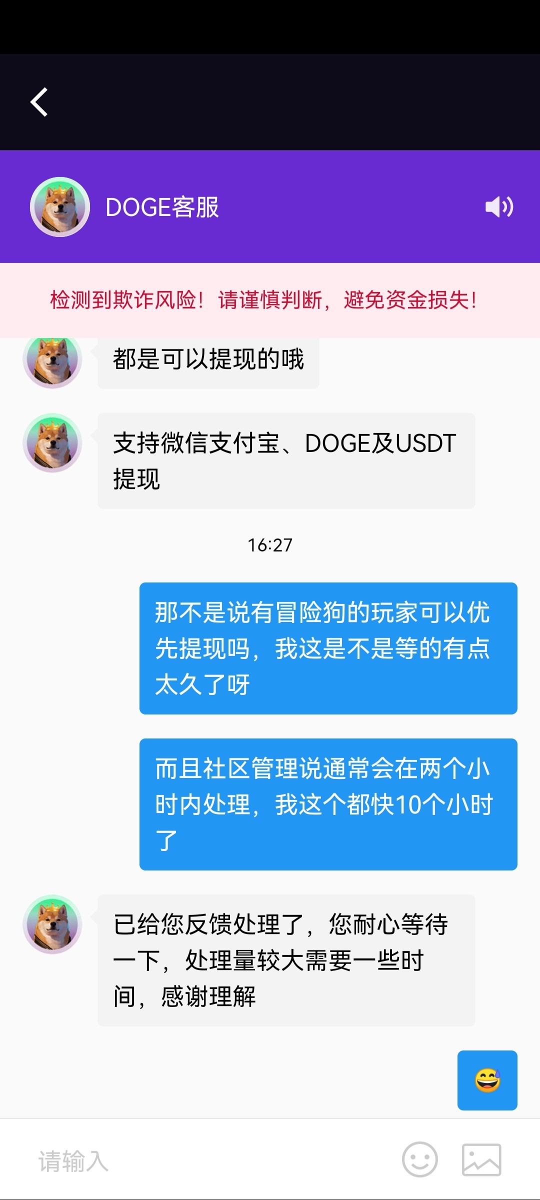 一开始我没进那个社群,结果说提狗逼比较快,我也不知道就提的u,卡了十个小时不封号,也不给不,就是一直处理中,找客服就说反馈了出款人多,让等,等着呗看看到底怎么个事,反正分比没花