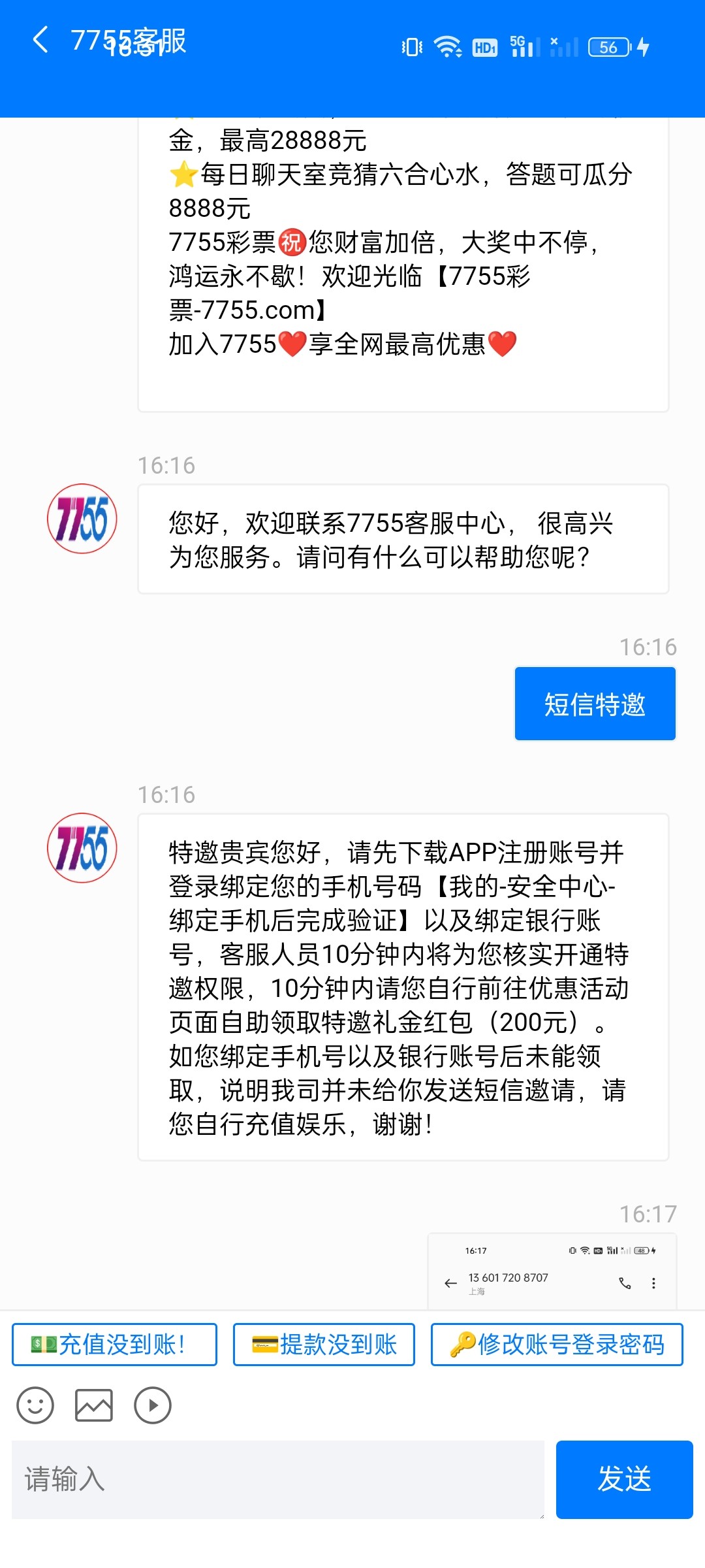 7755短信特邀 没打出来 自己去碰瓷一下 56789.qpon 注意:不要充值 出款自测