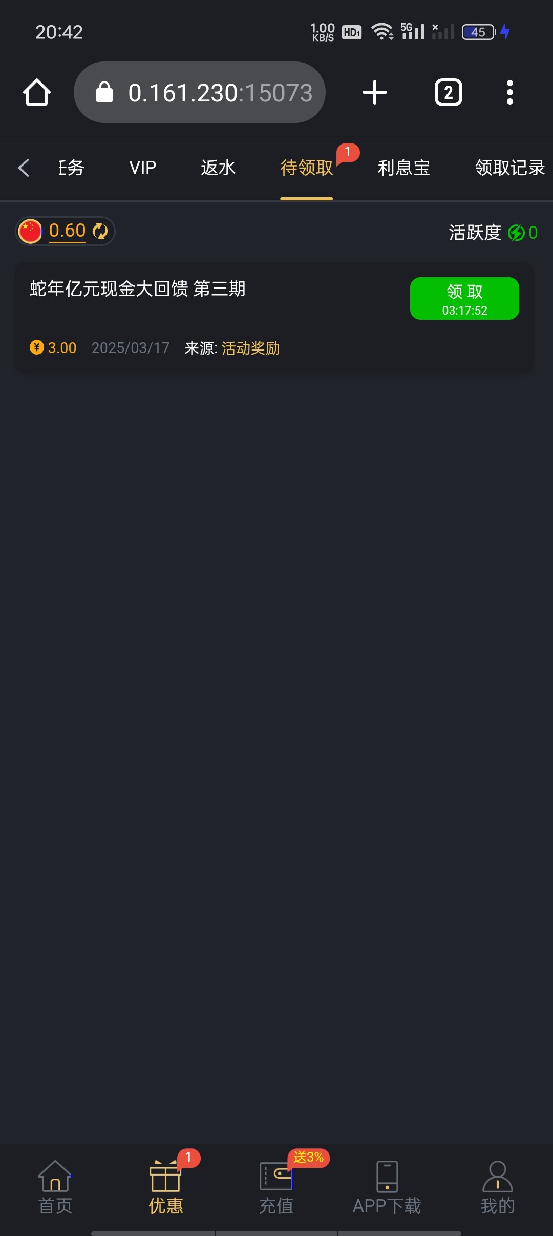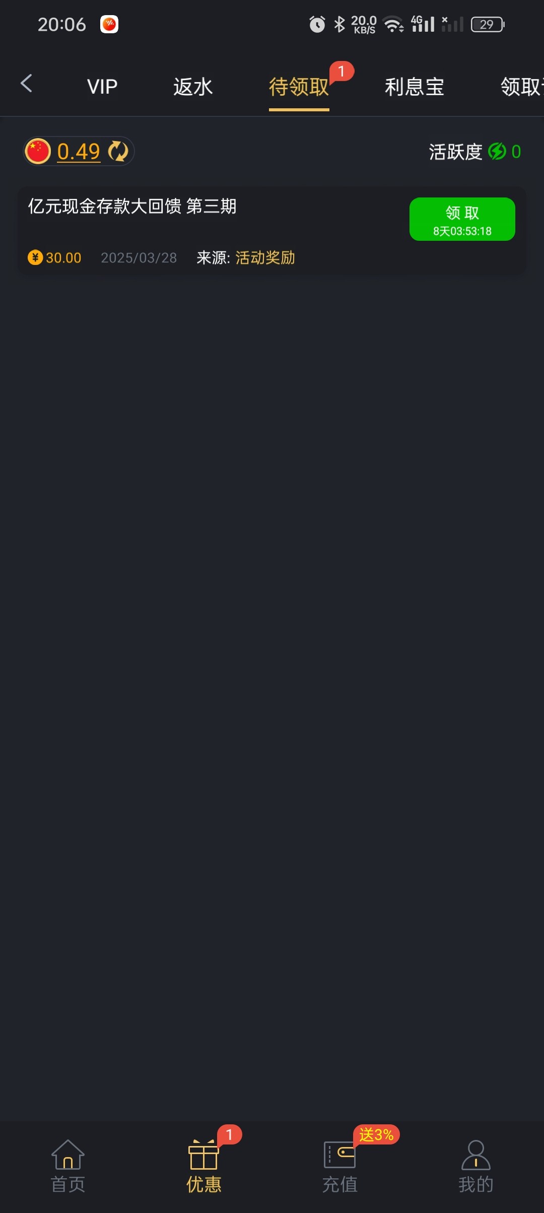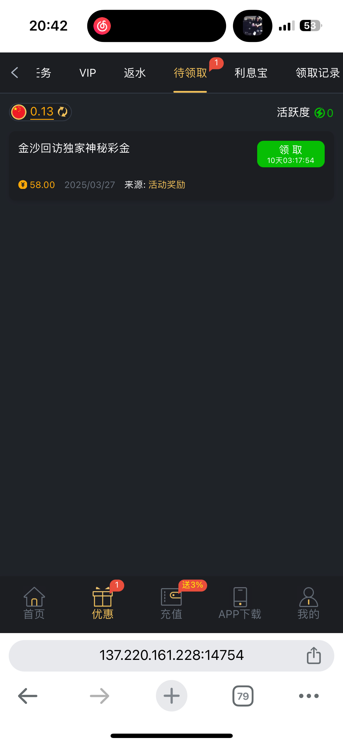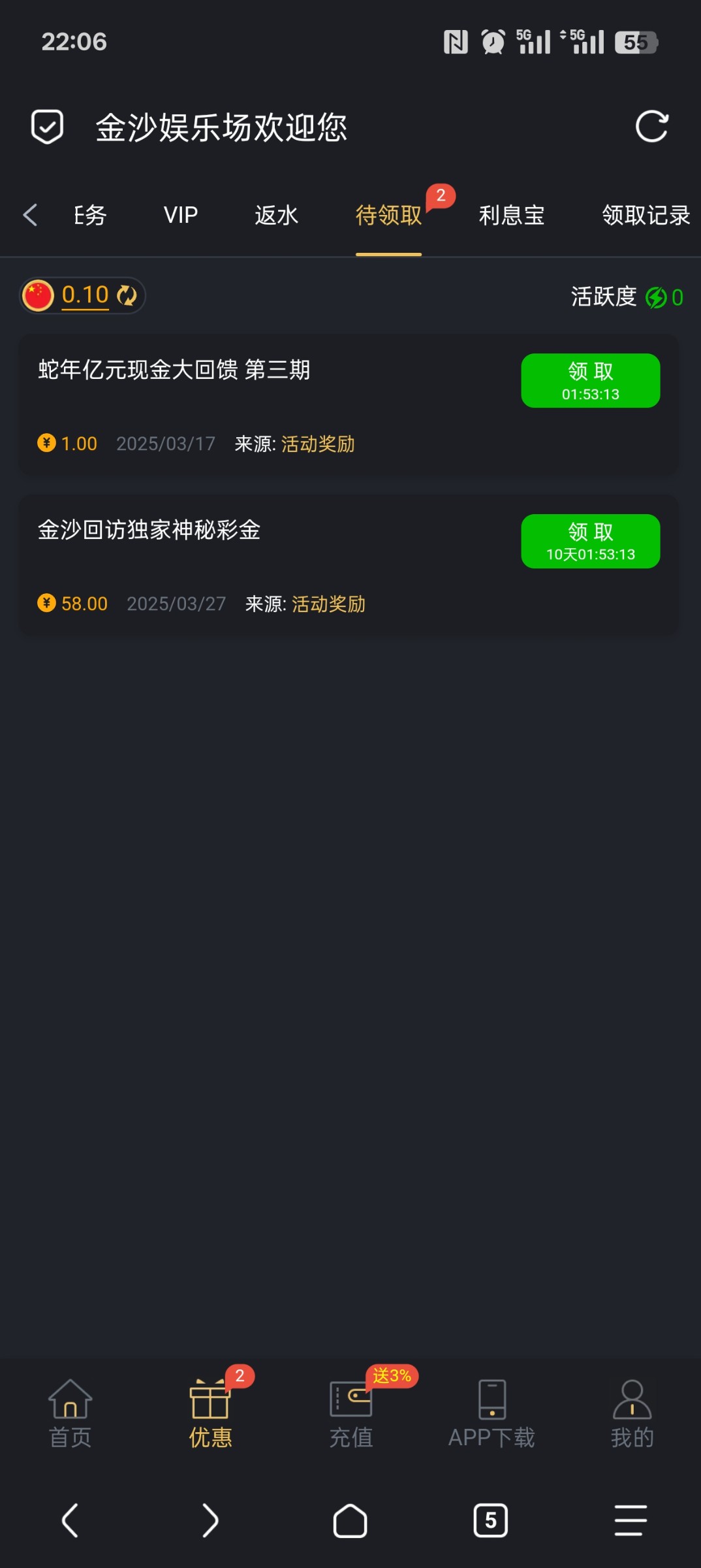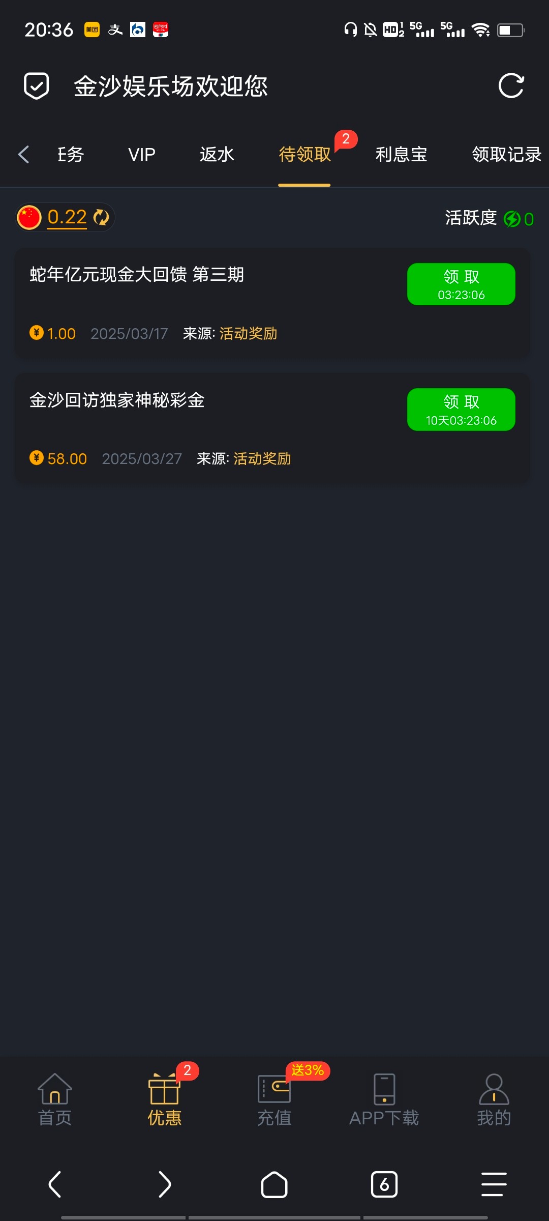 金沙9018回馈30彩金,不知道是不是都是30彩金,这个回馈彩金应该是充值玩过的才有,有号充值有充值过的可以上号看看。网址:9018.com