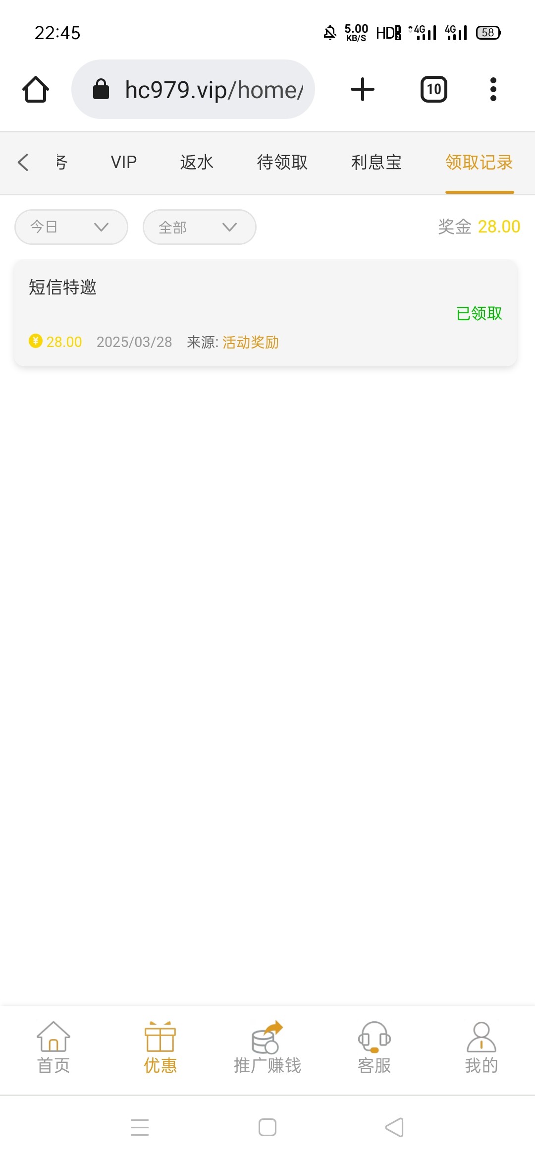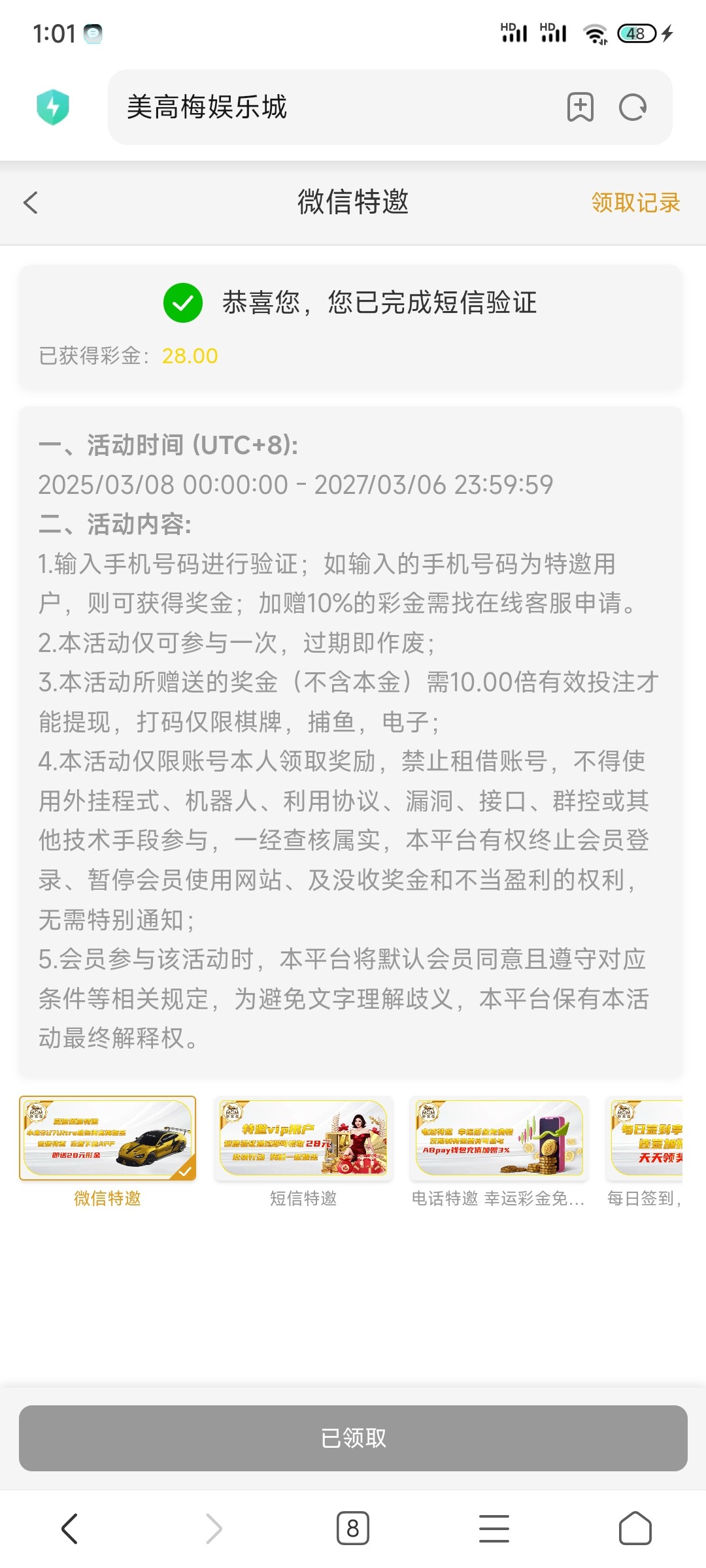 微信跟短信特邀都可以领,我是微信特邀的,活动里面自助领28,这种的可以先注册账号不要手机注册,输入手机能获取验证码就是特邀了。 网址8586.vip
