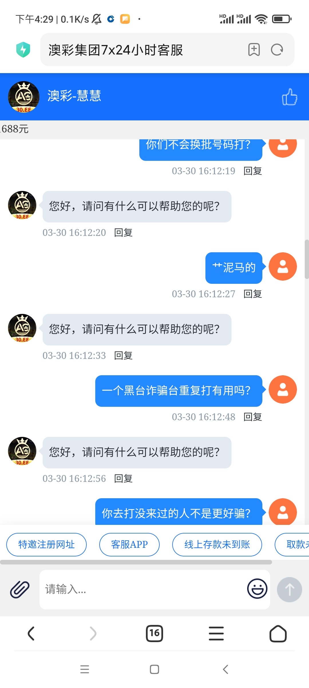 这个澳彩跟他妈死了妈一样,天天给你打电话,我几个号吗隔段时间就给你打,跟个狗皮膏药一样甩都甩不掉,一给我打我就去骂他的在线客服