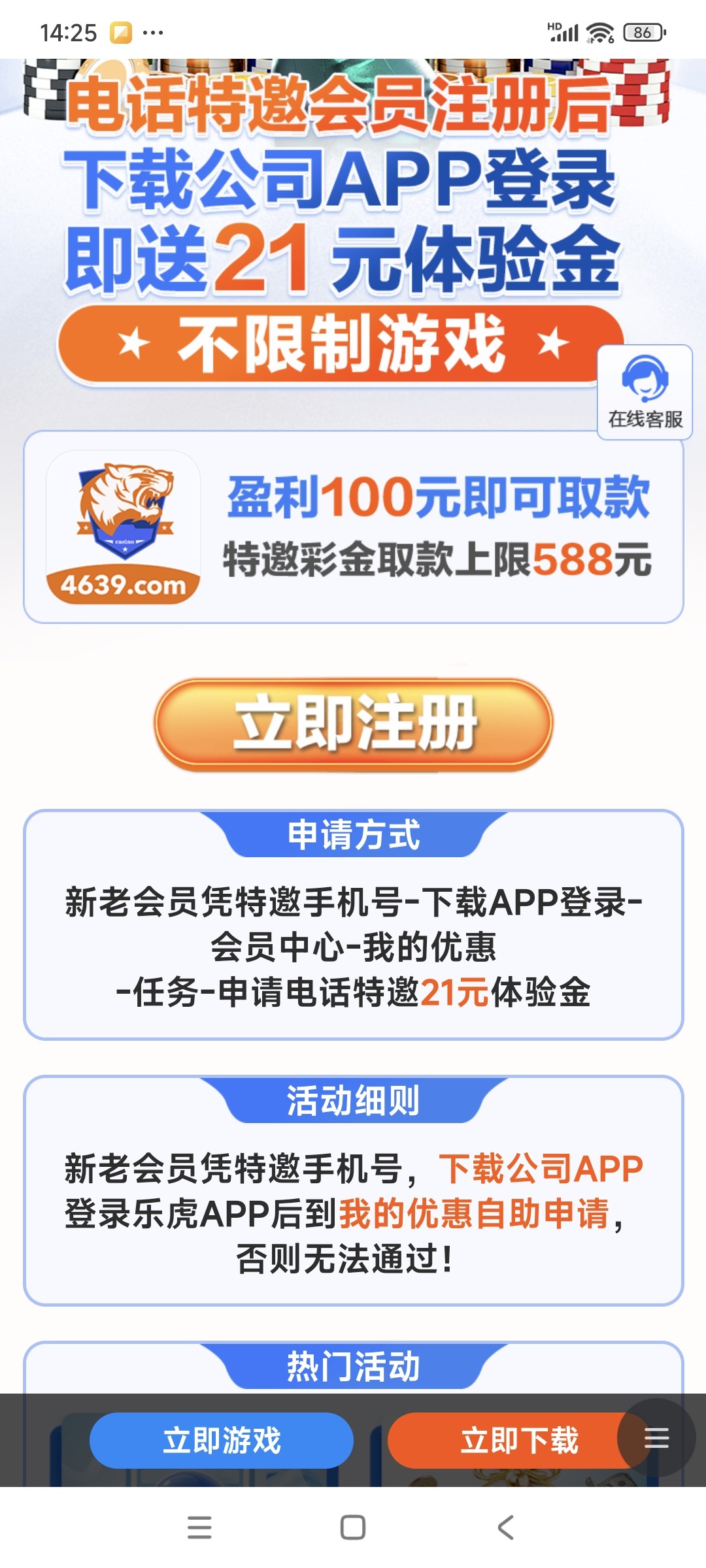 很早之前注册过,今天下午接到电话叫我上线领取特邀贵宾21彩金,最低提100最高提588。可惜我没打出来。特邀网址777137.cc