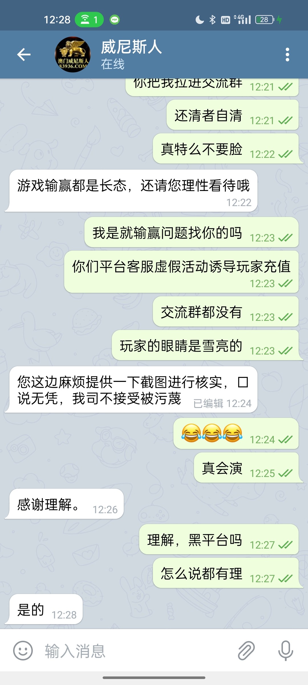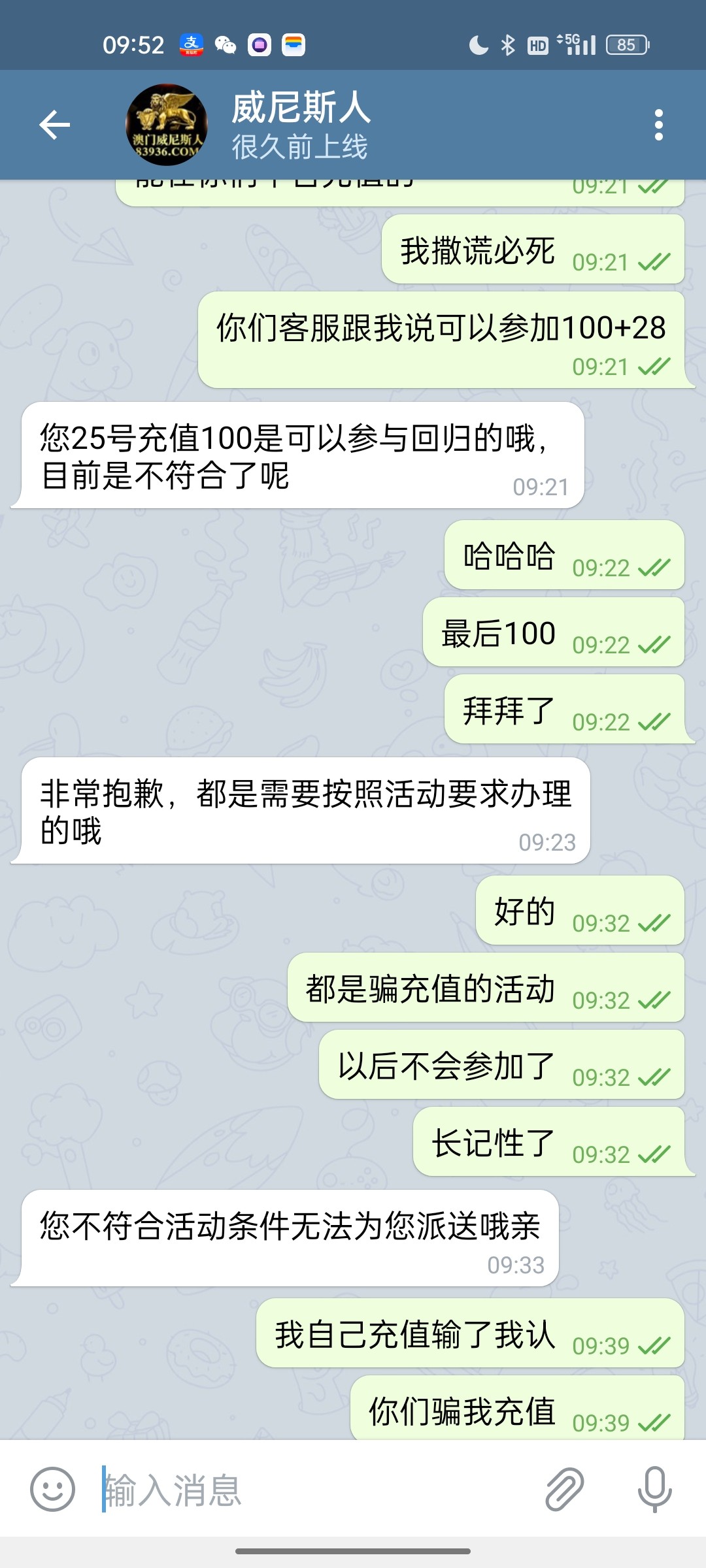 事情是这样的,27,28号在线客服跟我说可以参加100+28回归活动,然后我没充值,今天早上白嫖了200就充值了100,充值完找客服客服说我不符合,那天的那个客服聊天记录我没截图,反正现在就是人家客服说什么就是什么,咱们小赌狗没办法,我是这么认为的,我自己充值输了我认,为什么要骗我充值呢?而且本来这个平台就杀,我现在输得不想玩,他们平台没充值活动我根本就不会参加,兄弟们现在真的累了