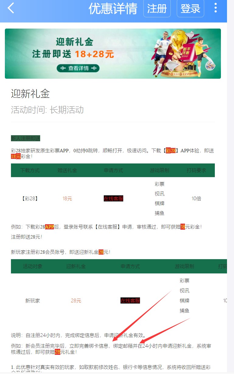 新用户下载APP注册绑卡绑定邮箱联系在线客服自助申请18跟28彩金/100提,彩金只能玩电子棋牌捕鱼视讯。