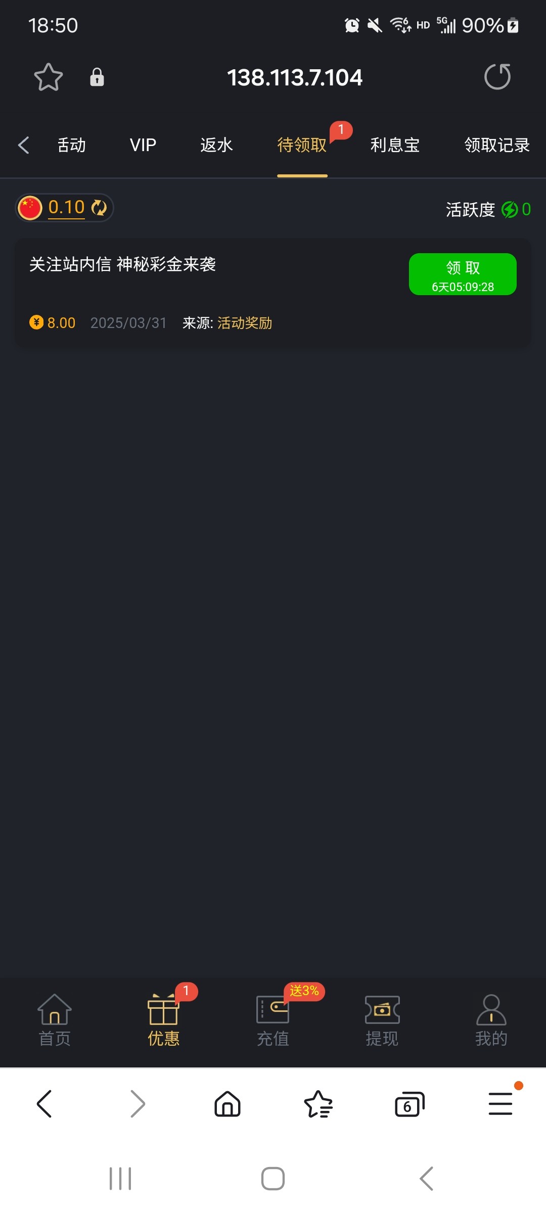 有号的登录看看,直接在优惠里待领取。彩金来源是随机发放。网址 432.com
