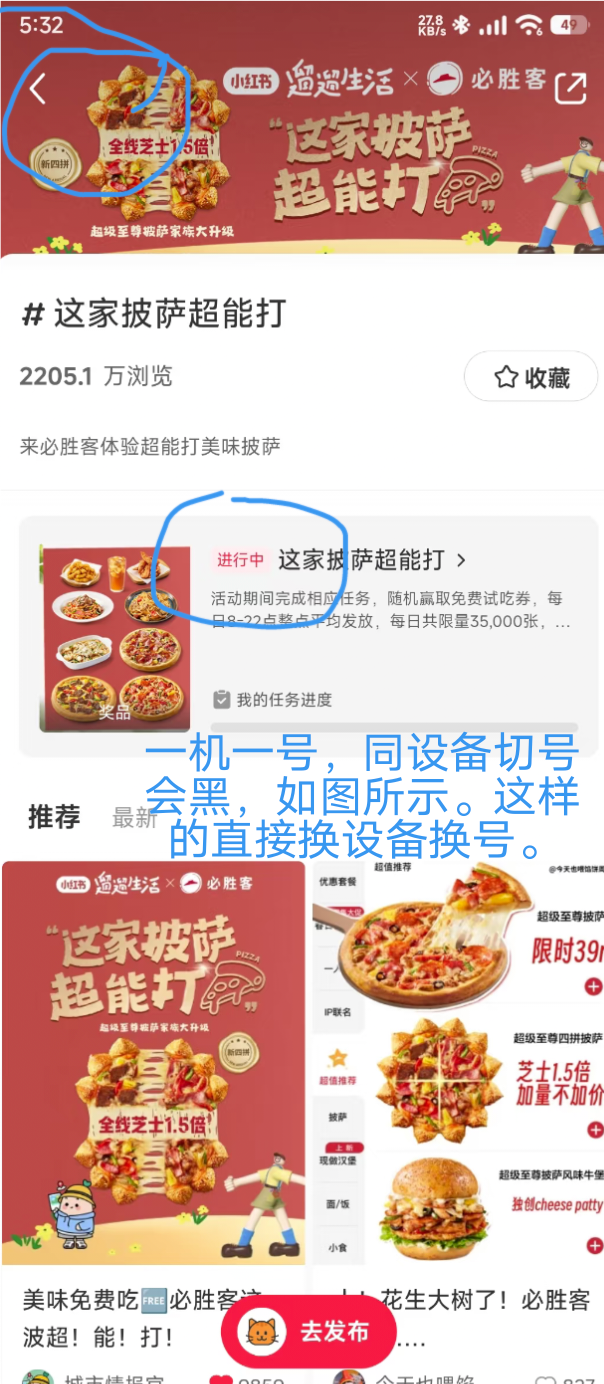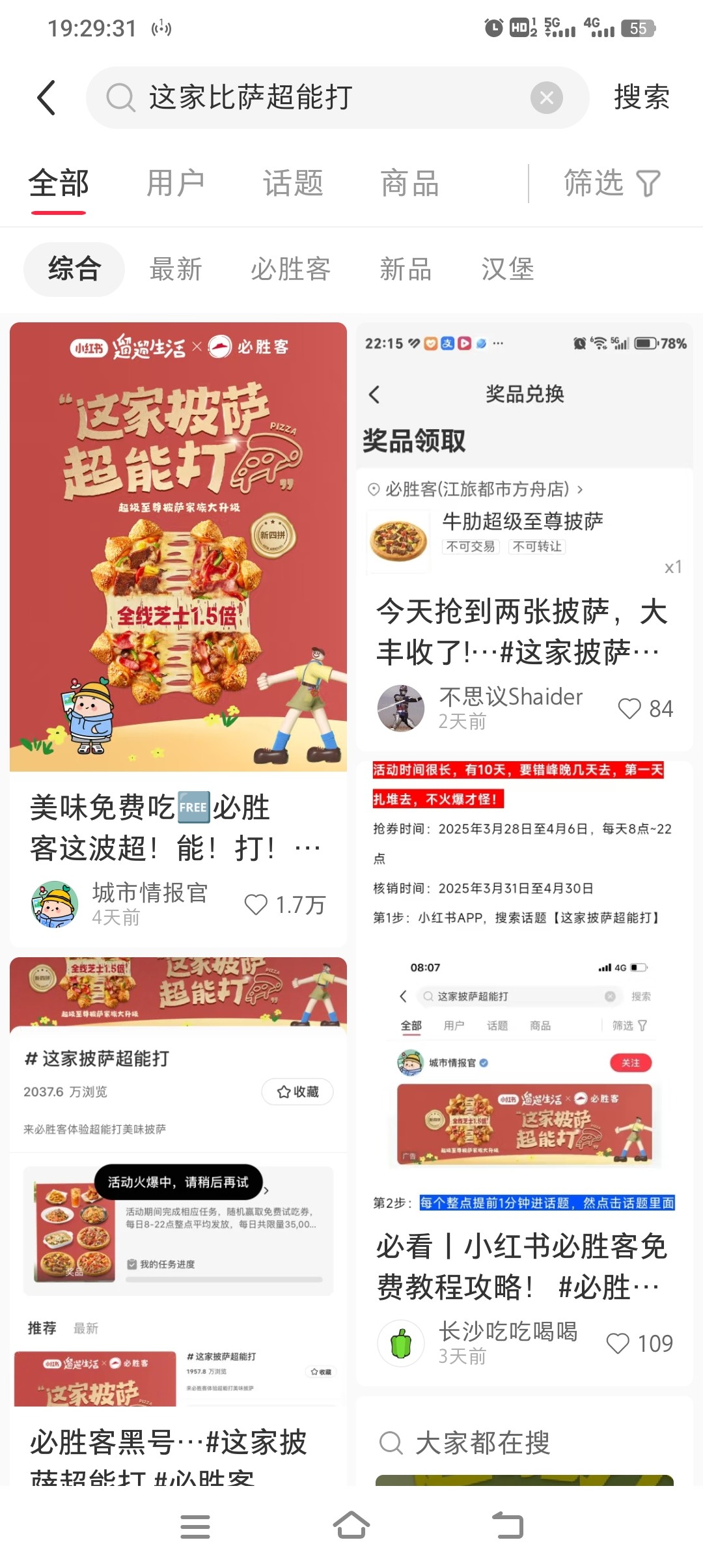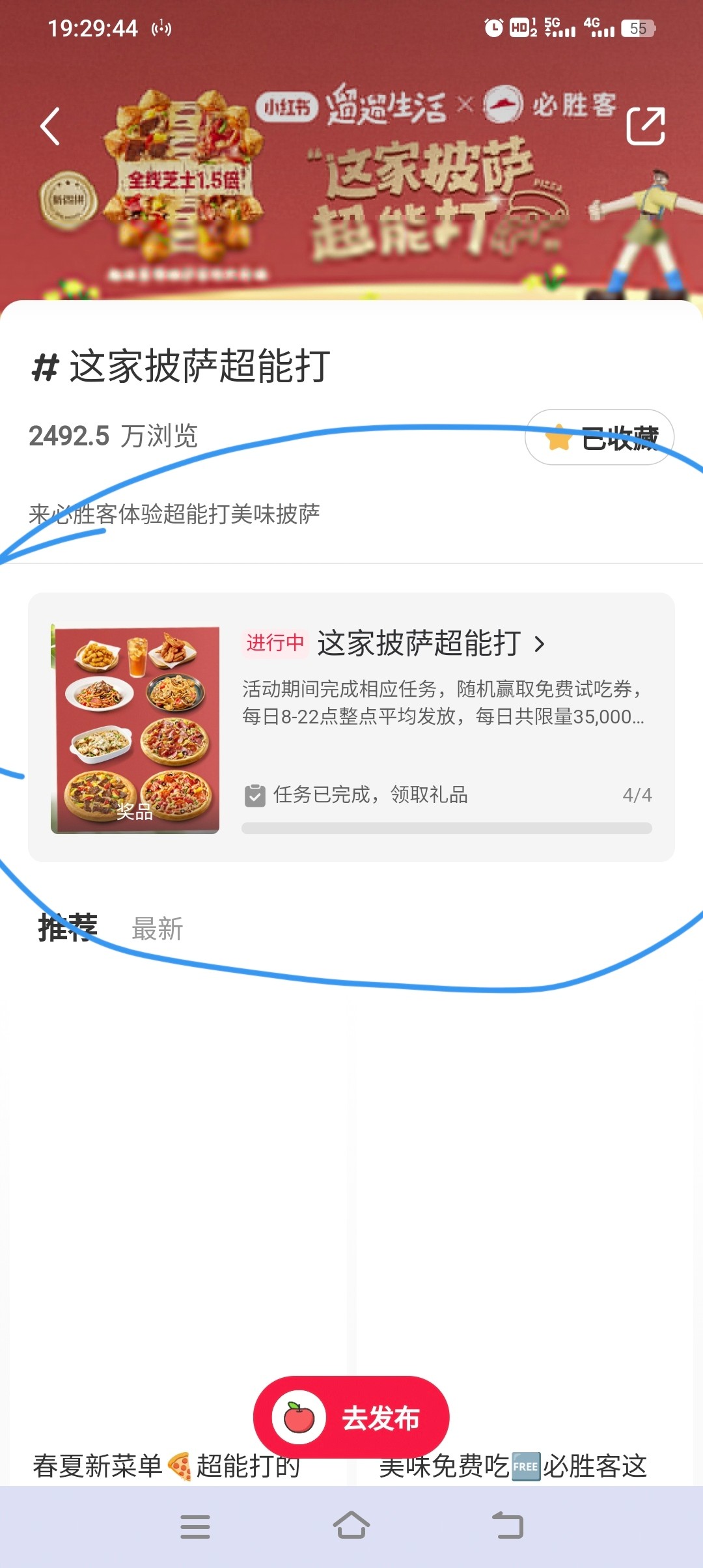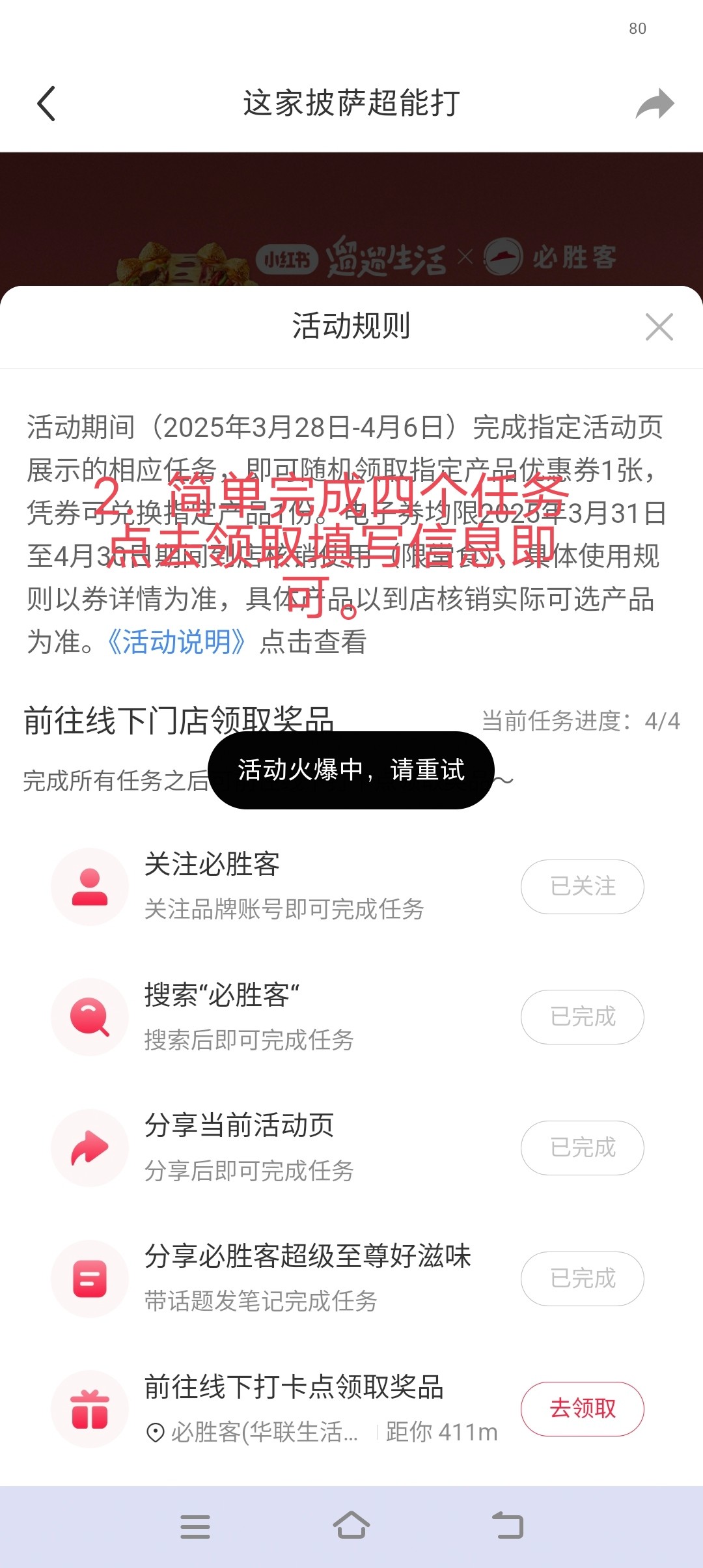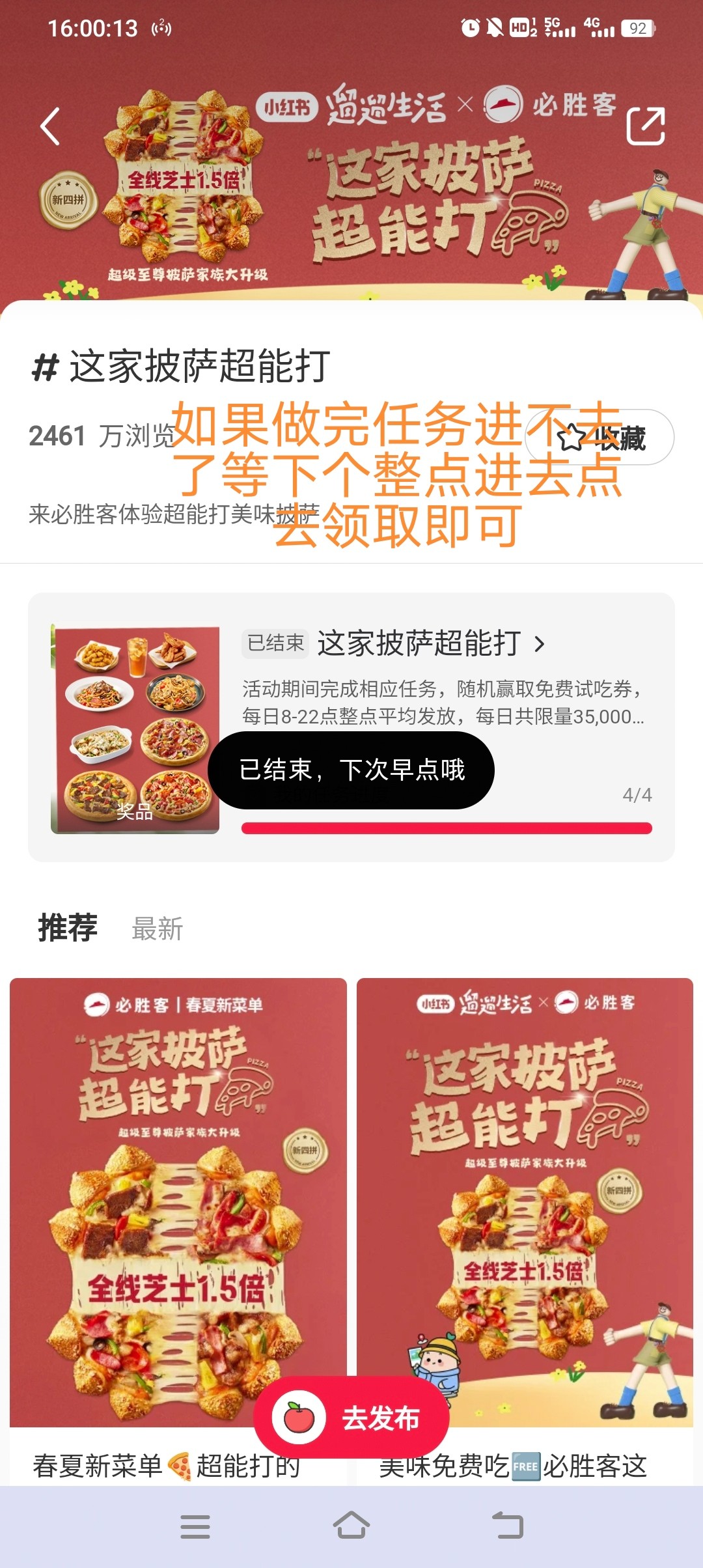 小红书app搜索话题:这家比萨超能打,进去活动简单完成4个任务,最后一步需要用连点器,提前进入,比如,完成任务了停在这个页面不要动,等下个整点之前,打个比方,19:59:50左右对准去领取开启连点器。直到他跳转页面关闭连点器,填写信息就好了。