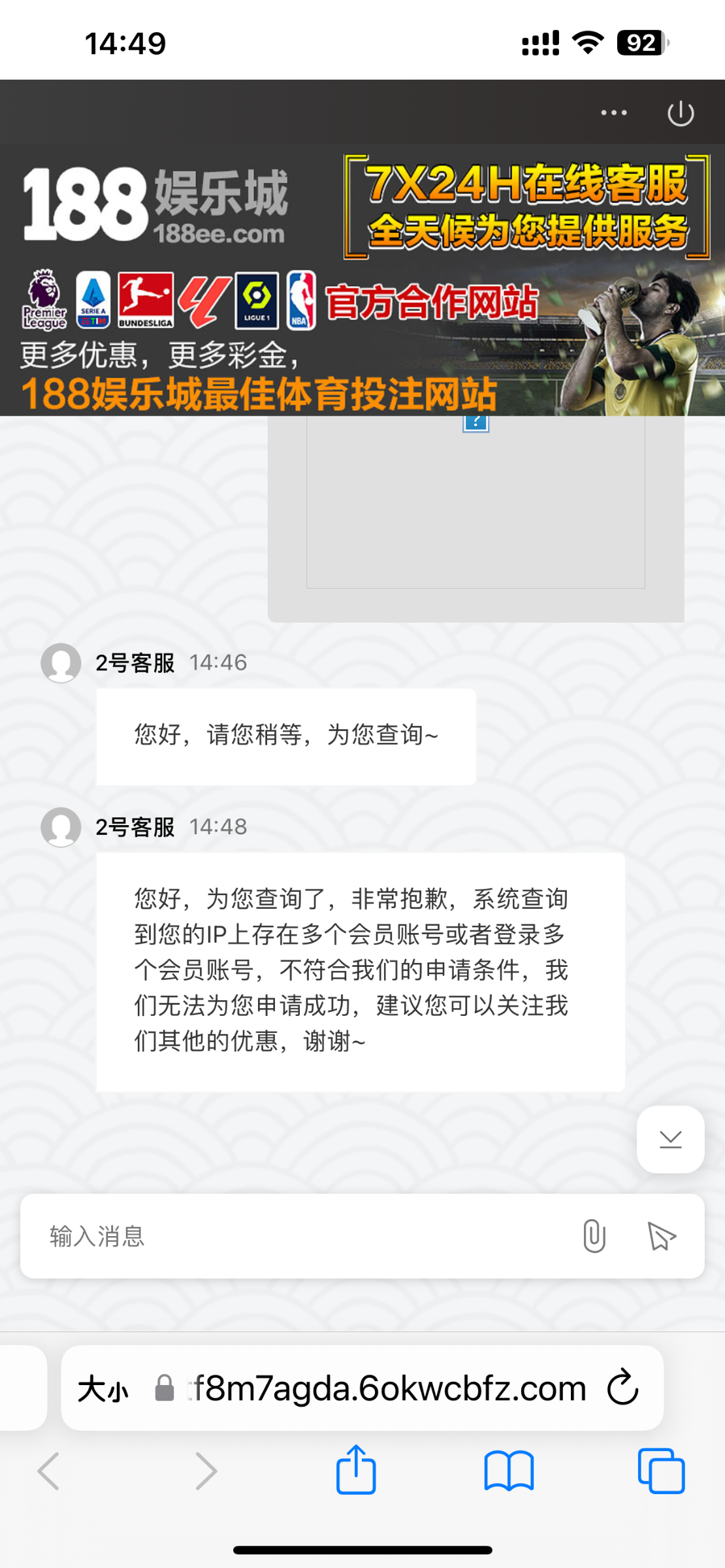 5号客服05:06您好,为您查询了,系检测到您的IP上存在多个会员账号或者登录多个会员账号,已触发活动条款,所以系统未给予发放彩金,谢谢~