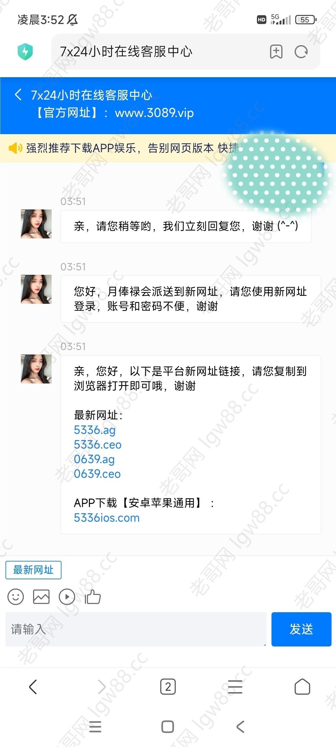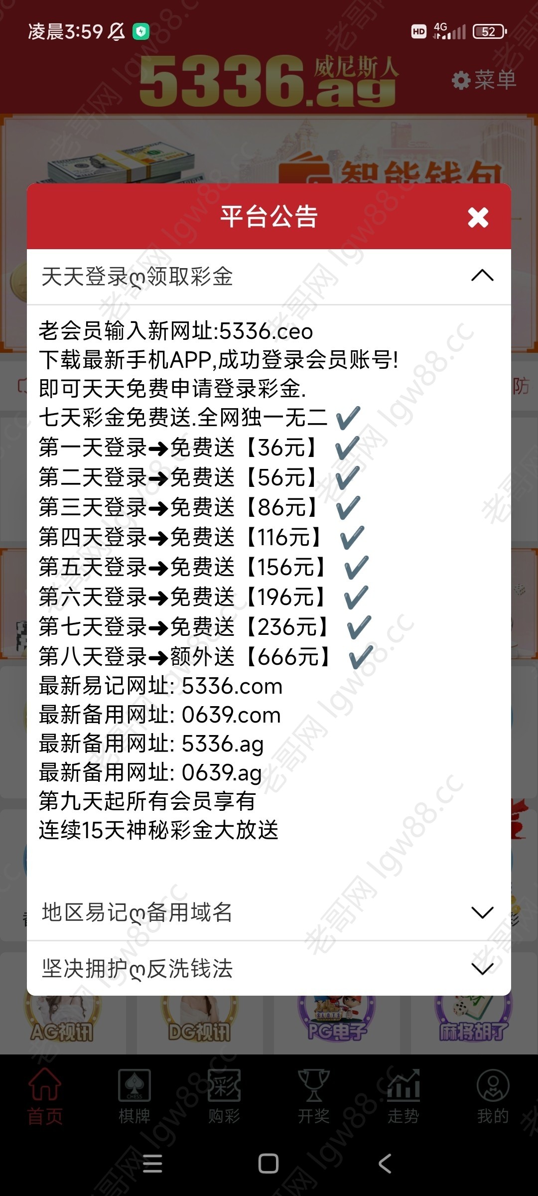 原6966.vip更换3664.ag现在更新为5336.ag。申请免费彩金必须是老会员。用旧平台登录找在线客服要网址,必须连续签到申请。不能断签。打出来老哥。给小弟团一个。没有的不要骂人