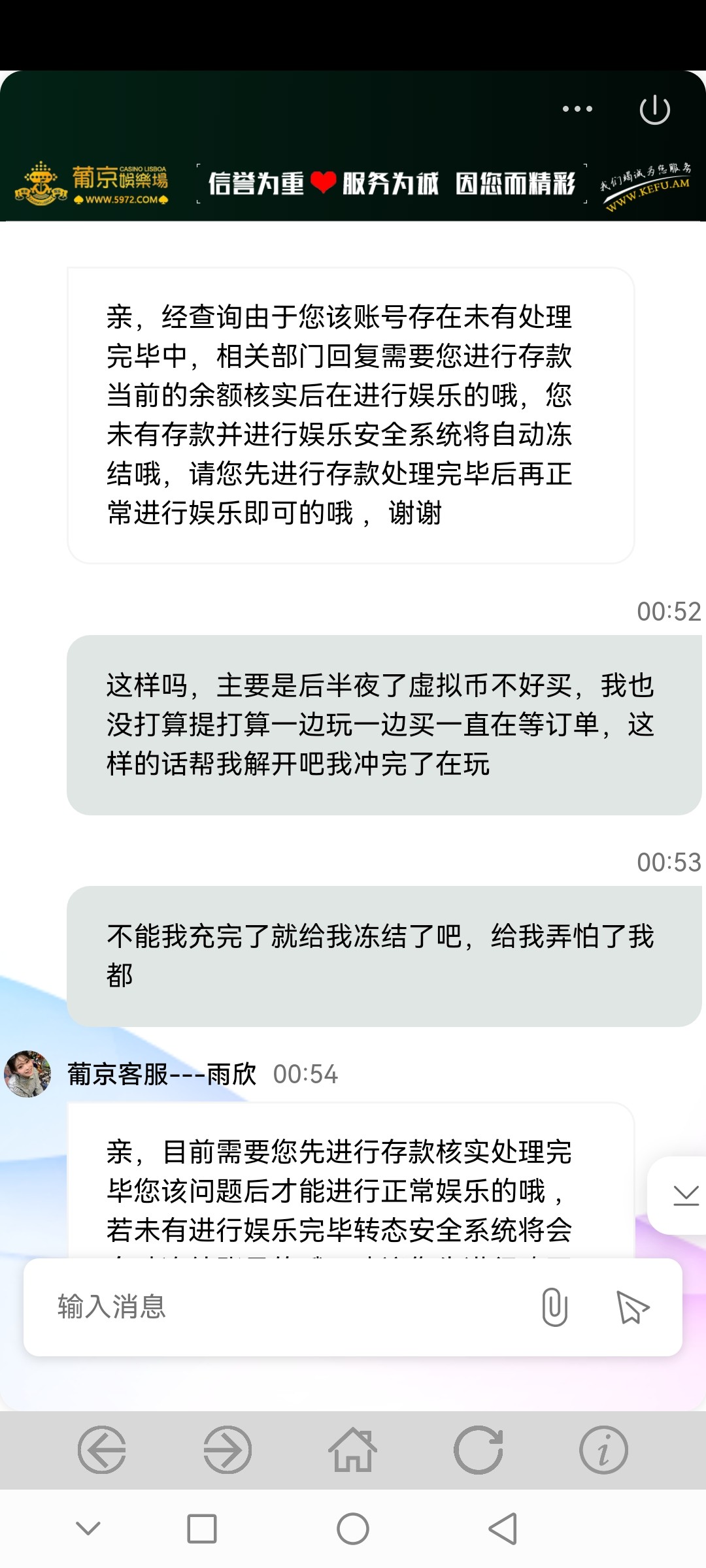 是这样的今天想充200拉个电子,结果买了半个小时币没买到,看见电子群里有人说代充,就找了一个充了200,用的808钱包,还说不说这个代充的人我先给他的钱,结果他也没跑我,确实给我扫了,葡京娱乐场拉麻将拉到480想换个游戏结果一返回掉线了,在登陆账号就被冻结了,一问客服说是808反馈我p图骗单,弄了半天才知道代充那个逼的币是诈骗来的,结果平台封账号,一开始不给解,磨了两个小时给解了说让我验证本人,总本人钱包充值余额同等,没充之前余额不能玩,玩了冻结,试过一次了,现在没钱,打算有钱顶一顶,我也是无语了,都不知道该怪谁