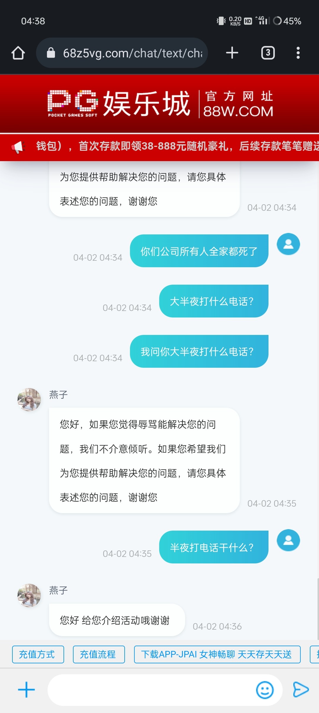 凌晨4点多给我疯狂打电话,接了就挂,后面接了说什么转移成功了,我就知道是星际这个杂种,真尼玛恶心,原本想开飞行模式睡觉的,一直疯狂打,我就去上面找客服问了,还真是这个杂种打的,我去申请转移彩金没给我 骂了几句,大半夜来恶心我,操他妈的杂种台子