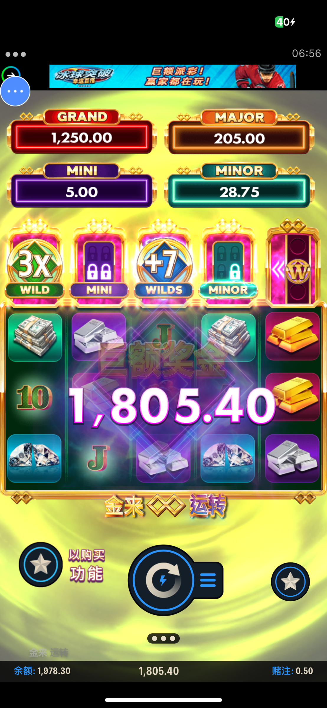 得吃了也是领了月亏损38彩金,磨了一晚上,一直在50左右,中间来了好几次大奖都差一点,以为也就这样了,想看看能刷多少水,结果直接爆了个最大的