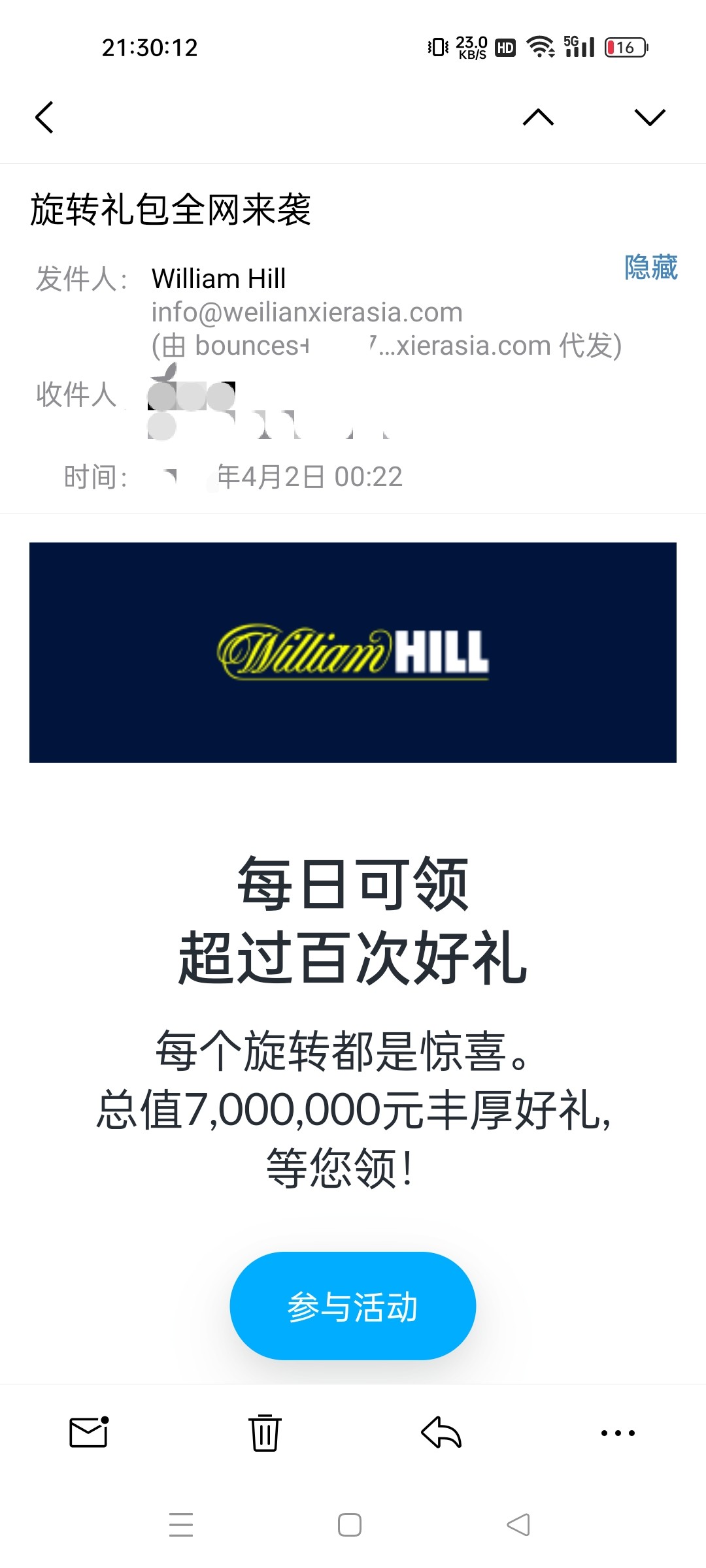 韦德领取免费旋转,有收到邮箱的老哥可以看一下 地址 43888.me