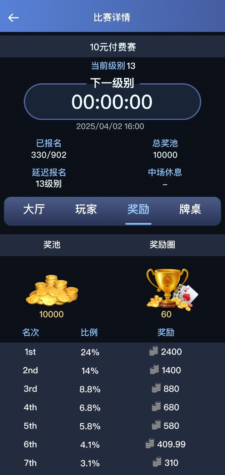 几个软件比赛打了一个月了,刚拿了个第二,单挑筹码10:2都没拿下,第二也好,万一不给出呢,jj6玩得少,之前这几个平台每个都拿比赛的10块上到100给出了,这次不知道给不给出