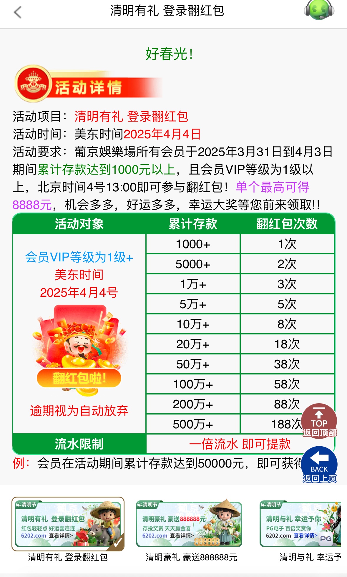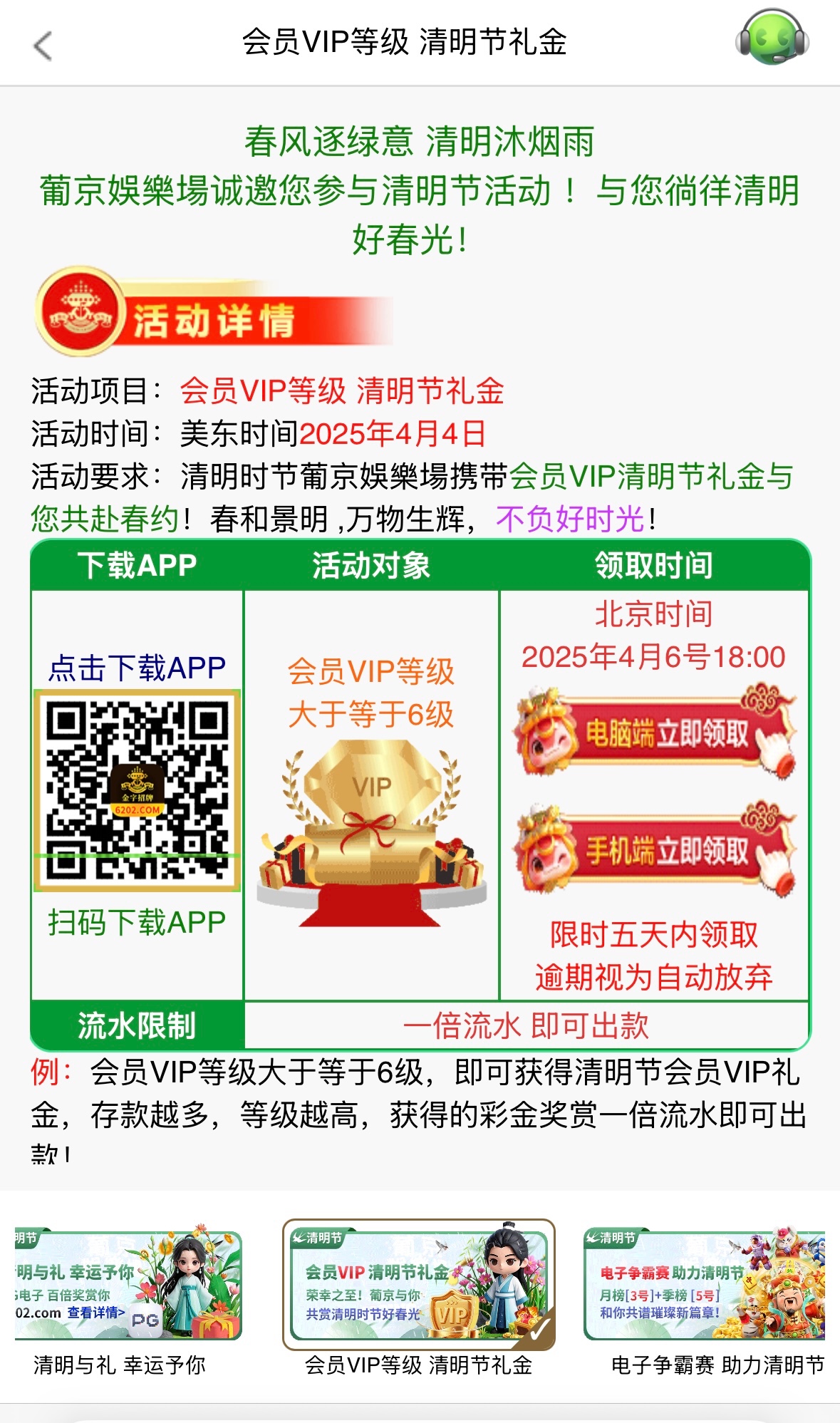 还有个vip等级免费彩金 v6或v6以上可以清明节当天领取