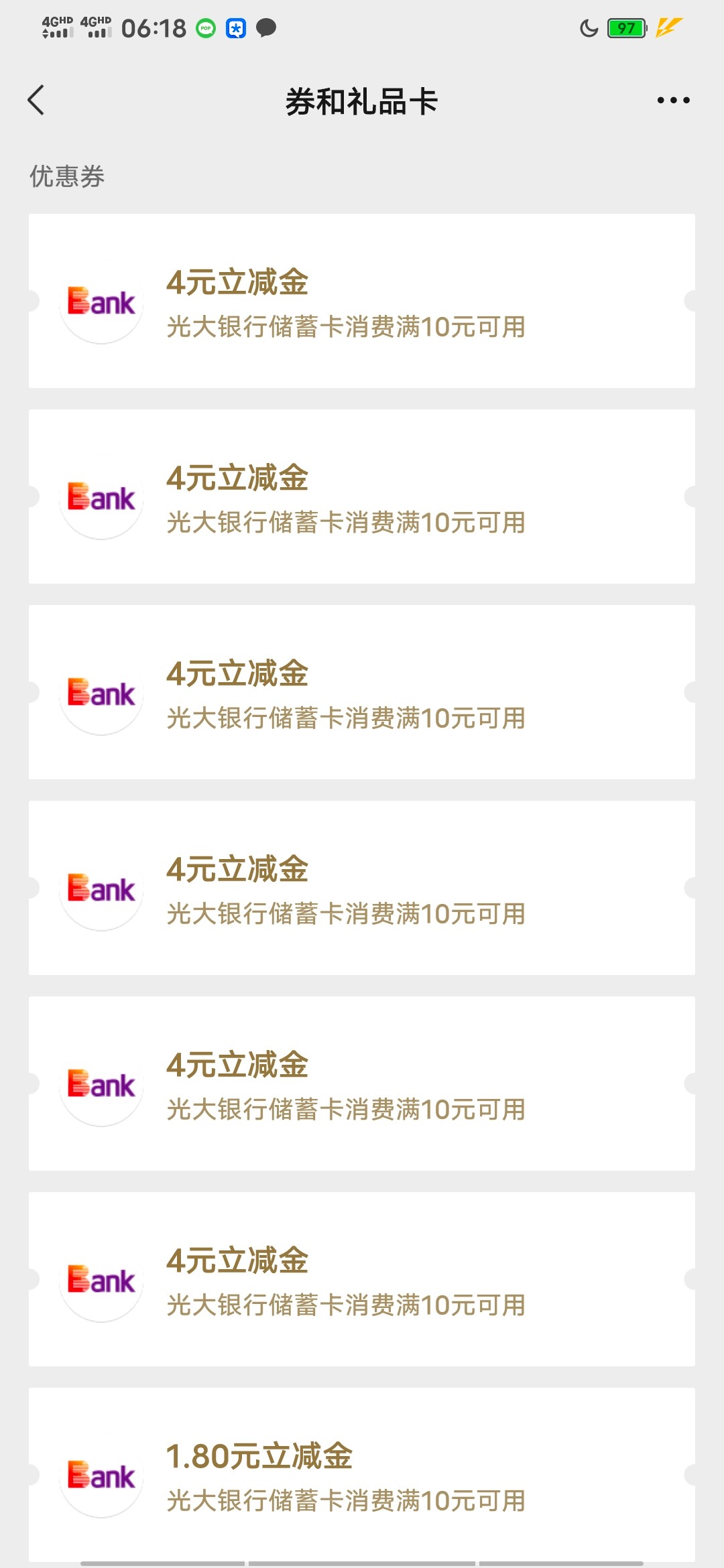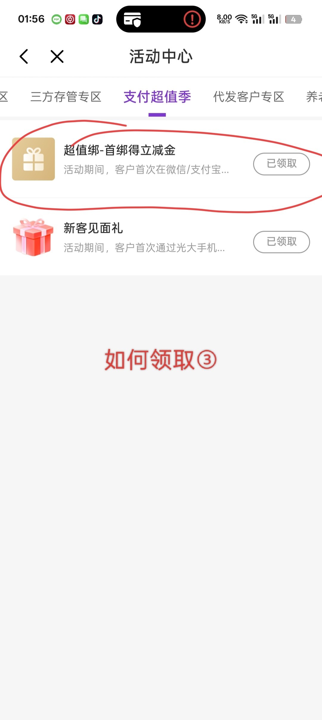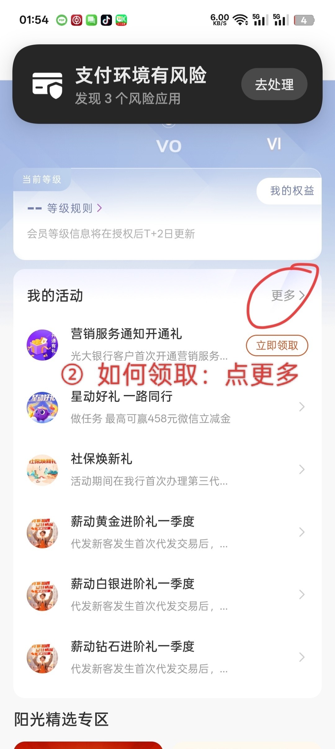 ①应用商店下载光大银行app我的页面左上角银行卡开通电子账户(开个二类户就行)有光大银行卡的直接跳过这一步 ②登录光大银行APP,点我的,进去权益,下拉找到圈中活动,或者首页搜索权益服务 (新用户开户后用开户行app给光大银行卡转账1.1元激活卡号,比如中国银行卡开通光大银行二类卡,就用中国银行app给光大银行卡转账) ③完成任务领10-28的微信立减金 领到的可以去商超买烟和吃的,一般都是24立减金,可以一起使用,老哥们速度冲