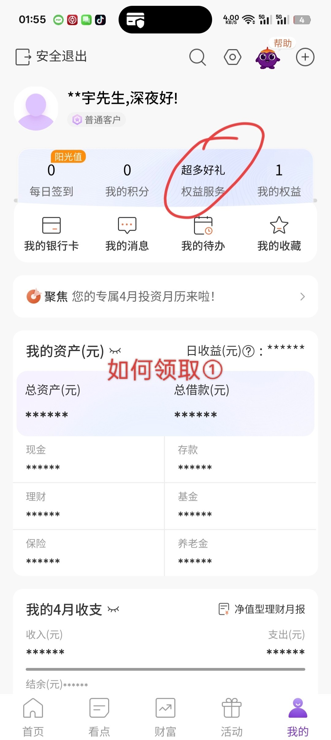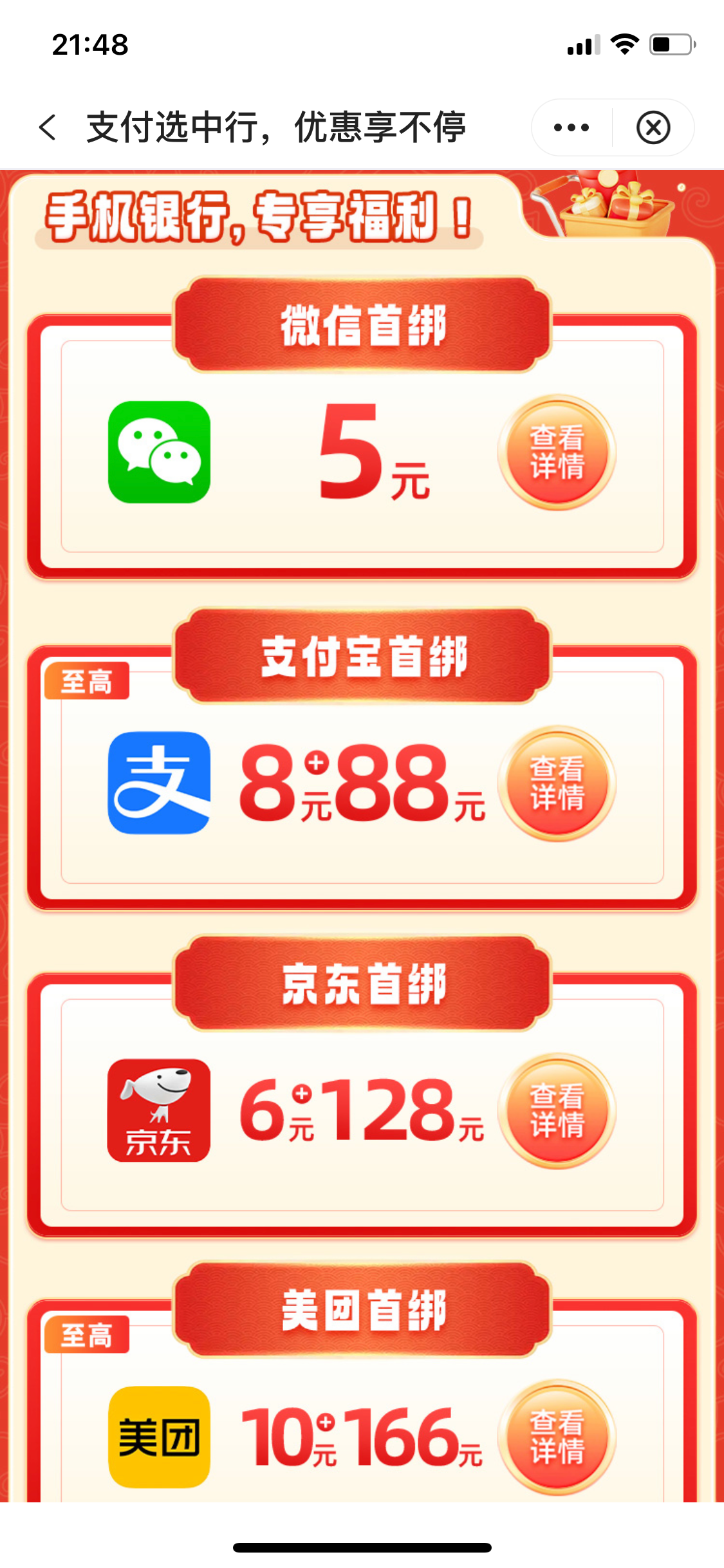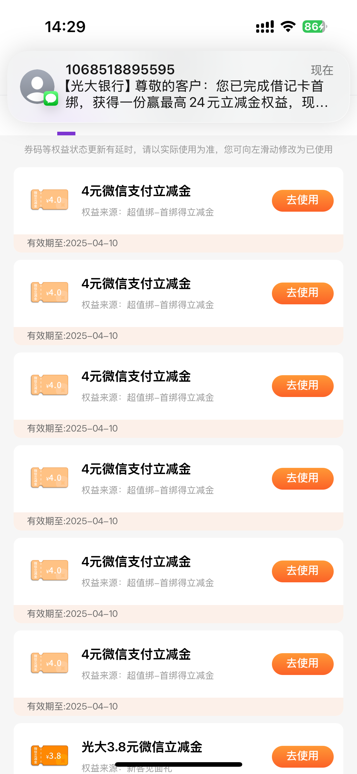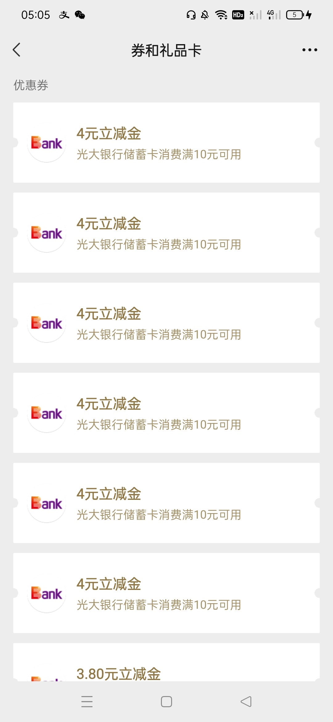 ①应用商店下载光大银行app我的页面左上角银行卡开通电子账户(开个二类户就行)有光大银行卡的直接跳过这一步 ②登录光大银行APP,点我的,进去权益,下拉找到圈中活动,或者首页搜索权益服务 (新用户开户后用开户行app给光大银行卡转账1.1元激活卡号,比如中国银行卡开通光大银行二类卡,就用中国银行app给光大银行卡转账) ③完成任务领10-28的微信立减金 领到的可以去商超买烟和吃的,一般都是24立减金,可以一起使用,老哥们速度冲