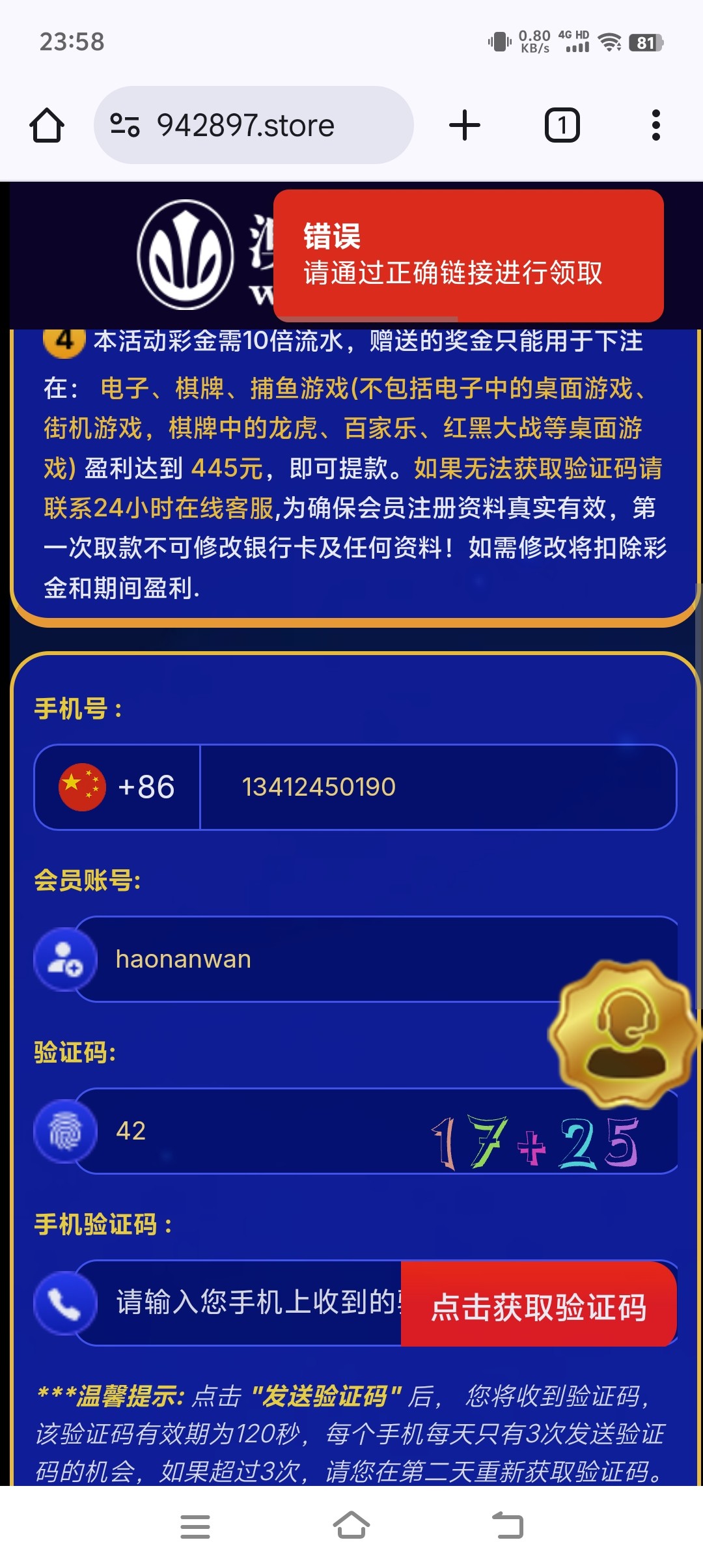 http://www.942897.store 链接 我是刚看短信 注册领取的 老哥速速通过