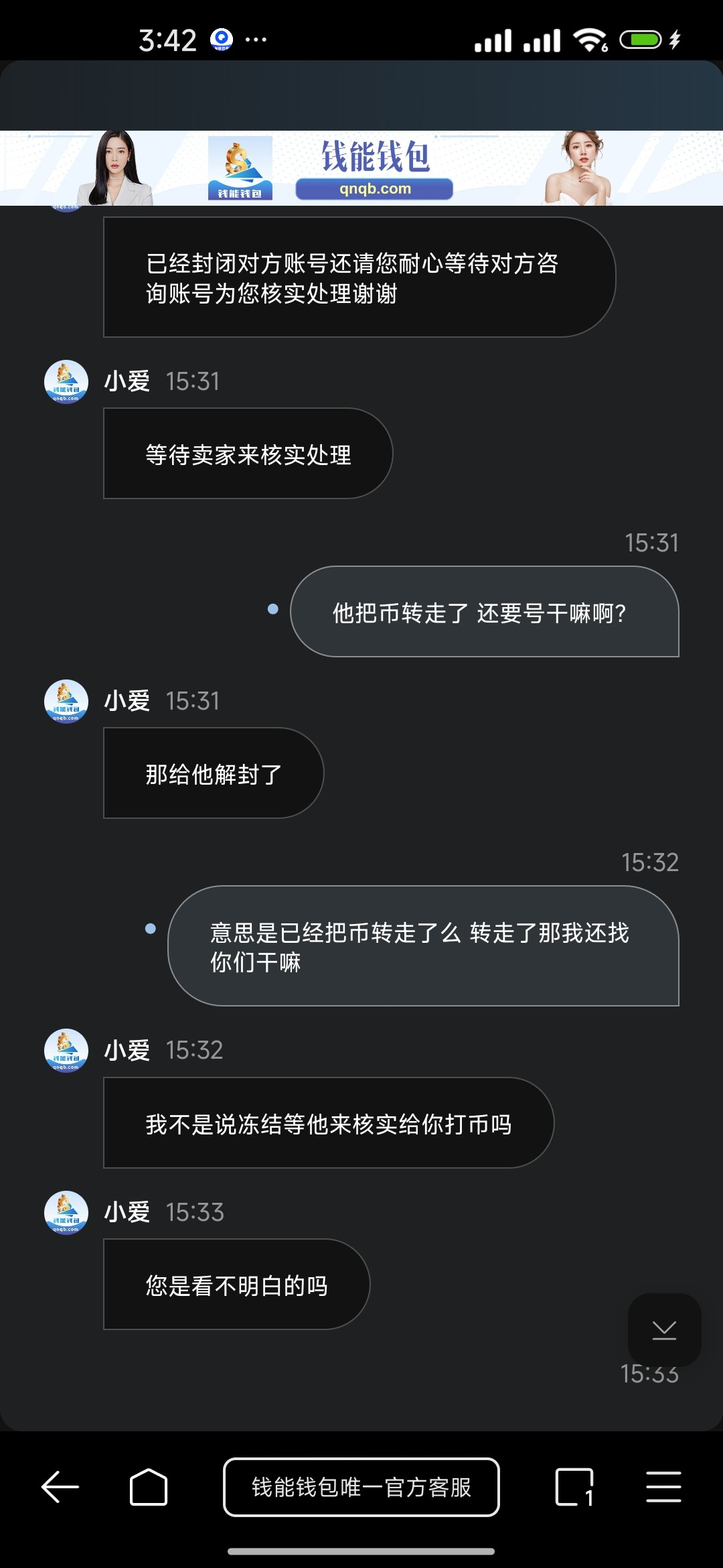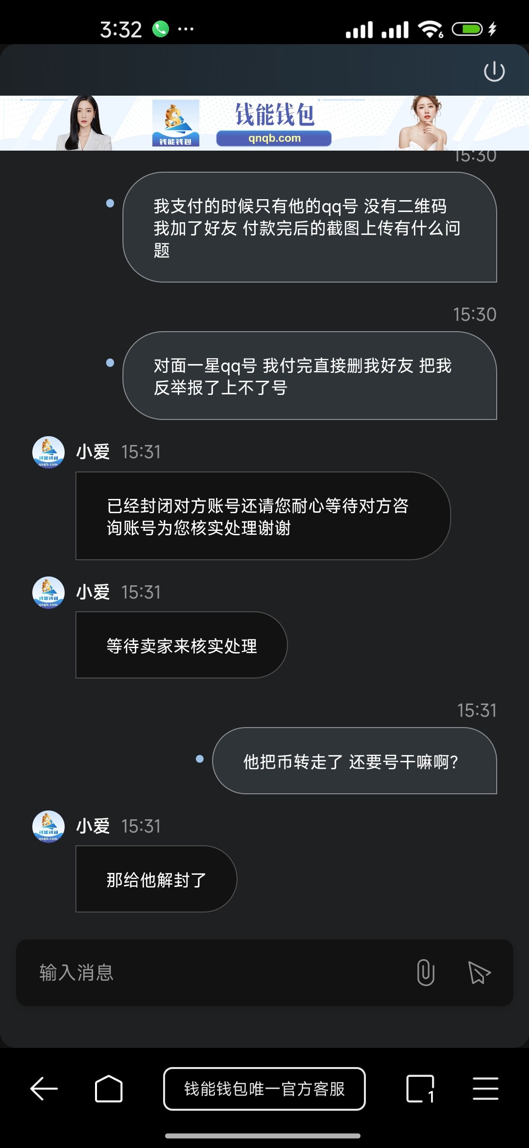 钱能钱包买100币 选的qq 没出付款码只有qq号 qq加了他转给他 直接把我删了。然后他找钱能客服说我只付了0.01 把我号冻结了 订单直接取消了 把币就直接还他了 我找客服客服各种不回复 直接断开连接,币还给别人半个小时了才封他 对面都能把币转走几百遍了 客服还是这种态度