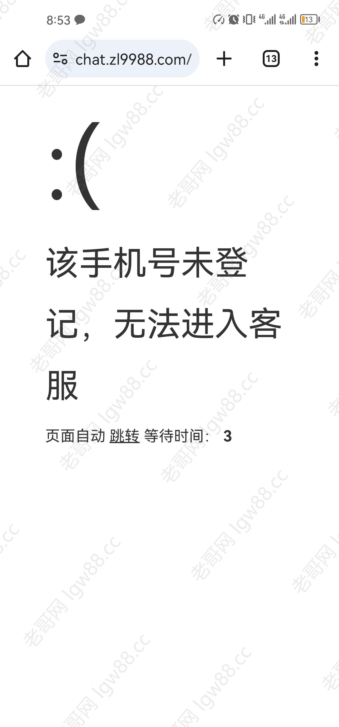 进去输入号码 如果成功就会转 https://chat.zl9988.com/index/index/verify 跳客服不成功就如图显示一样,成功的话就注册找客服申请288一杯水提现