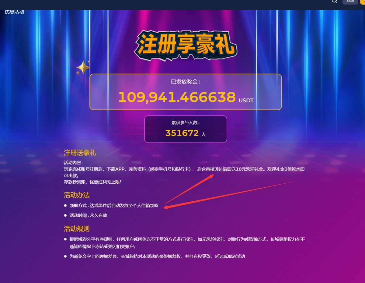 新用户下载APP注册绑卡绑定手机,完善所有资料,个人信箱自助领取18/100提,彩金限制自行查阅网站。