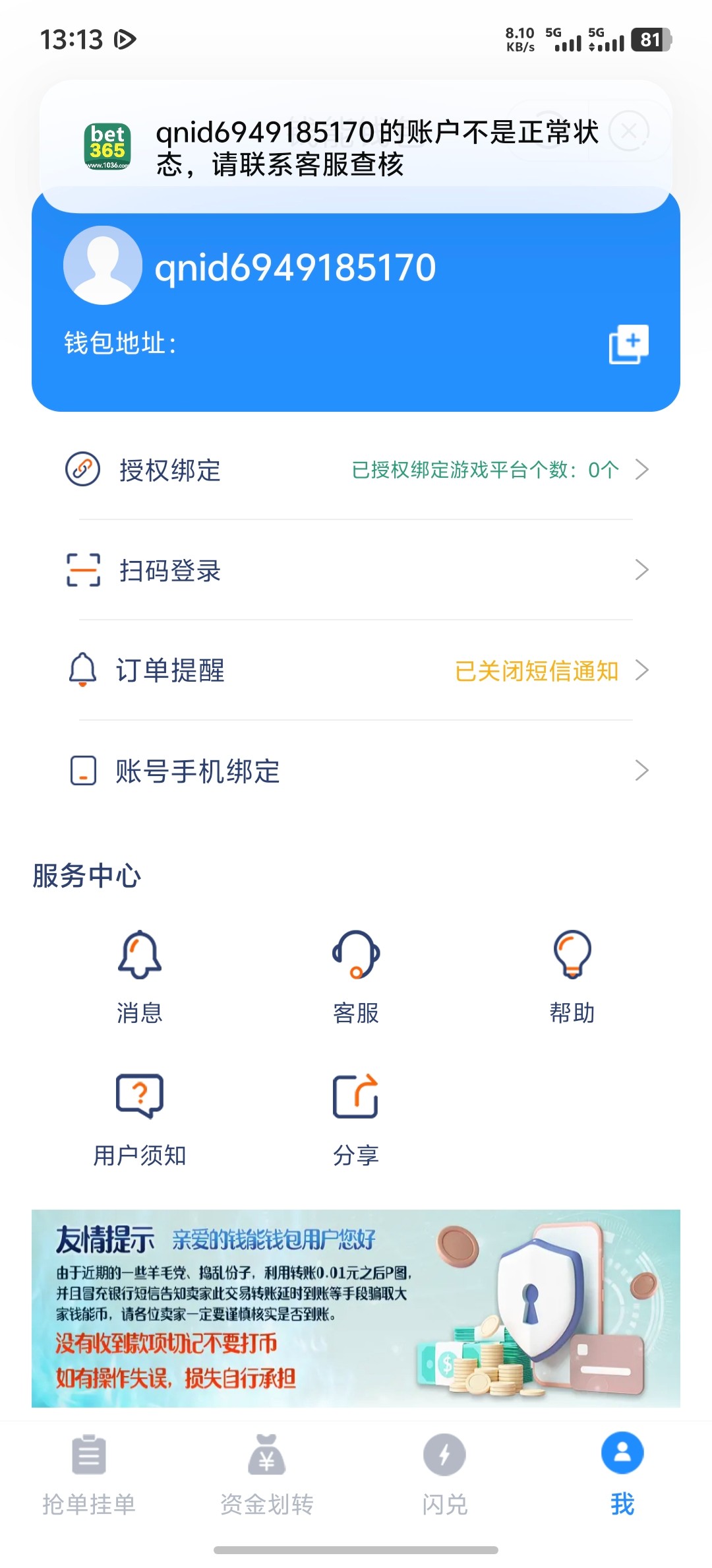 狗庄克星 ▶ cb311 具体绑定有哪些平台记不清楚了,目前改了登录和支付密码,不知道有没有用,电子钱包还是得用到账方便优惠也多,只是以后提款一到就要秒处理拖不了一点 9月前