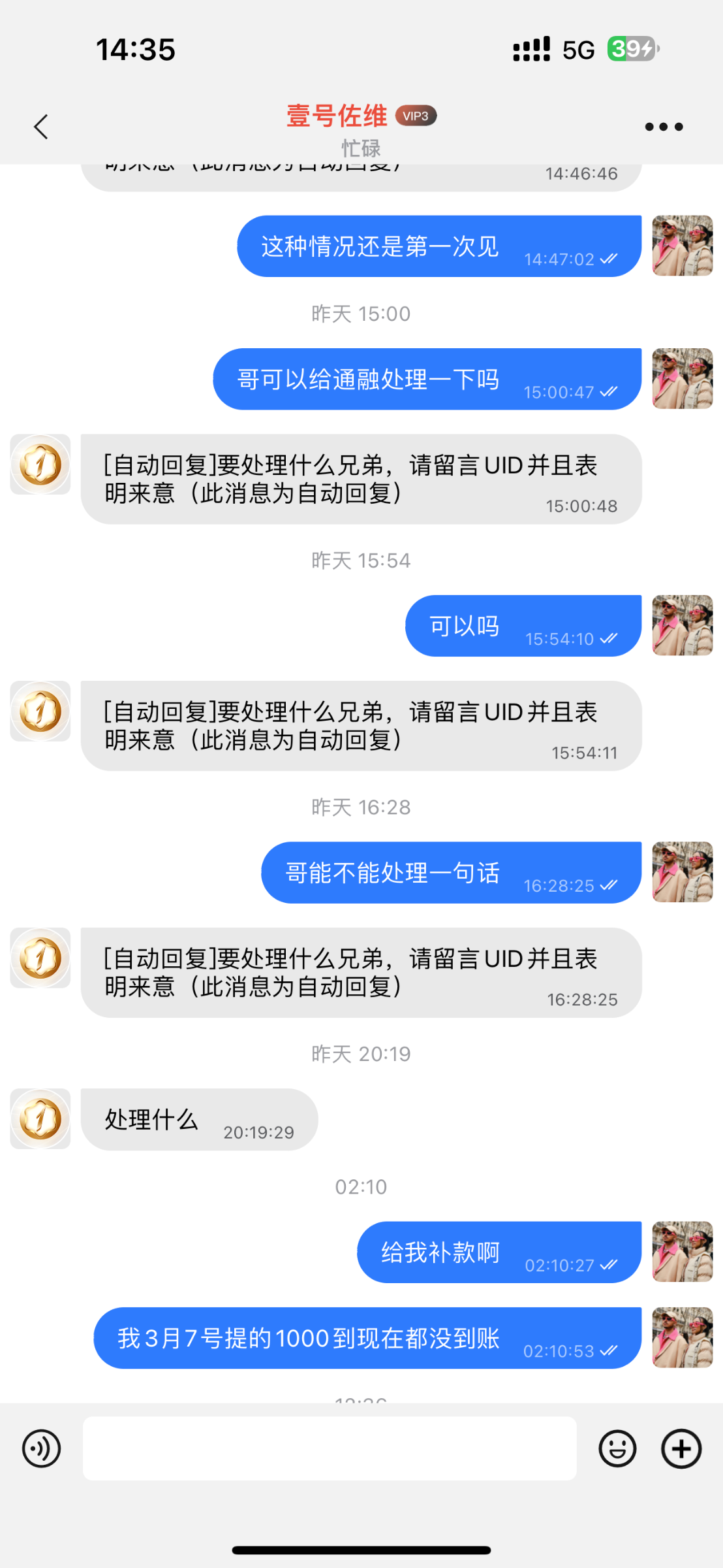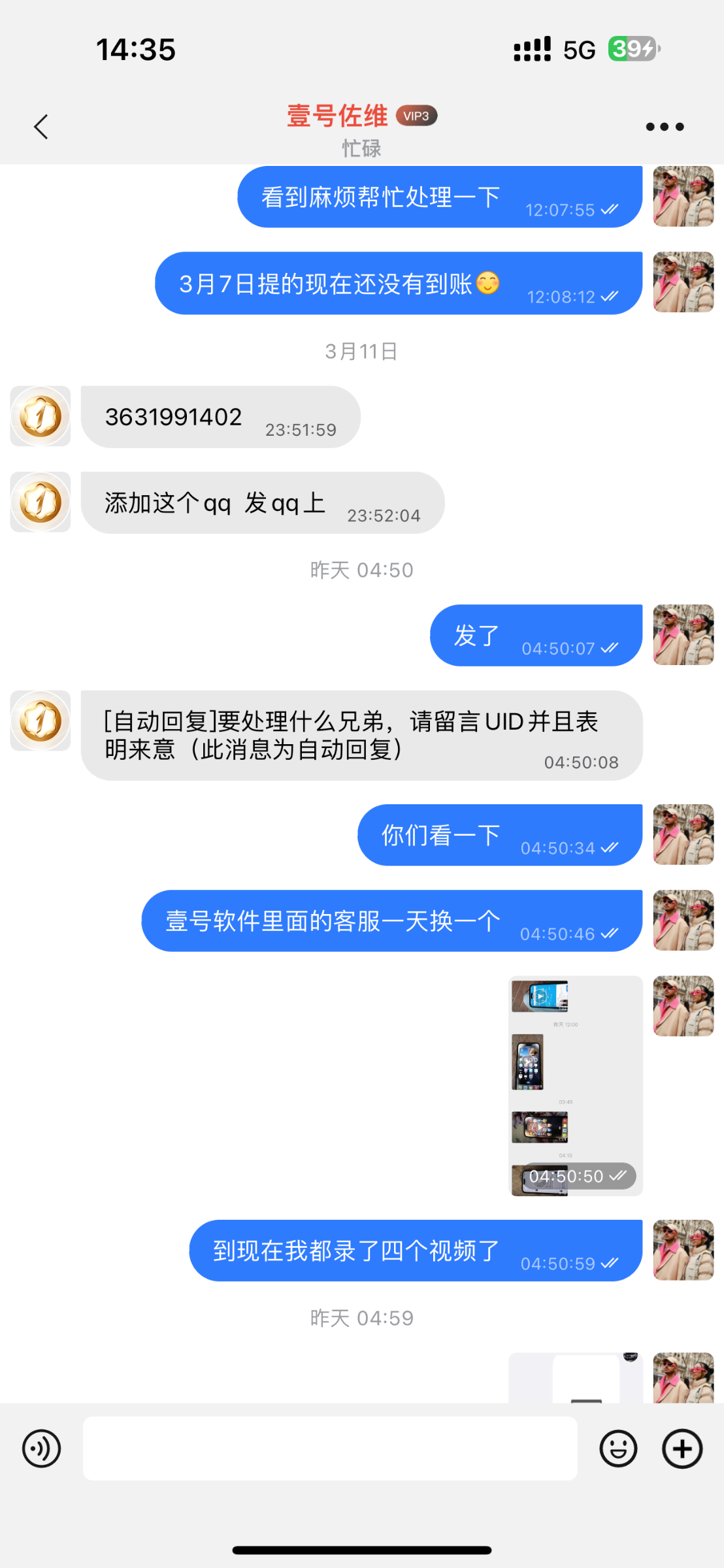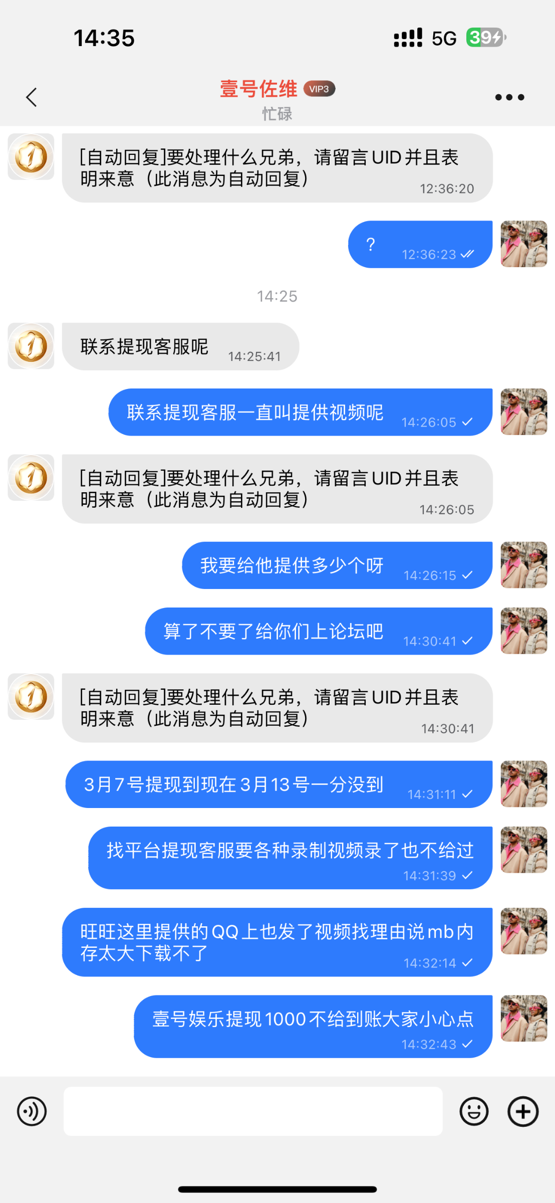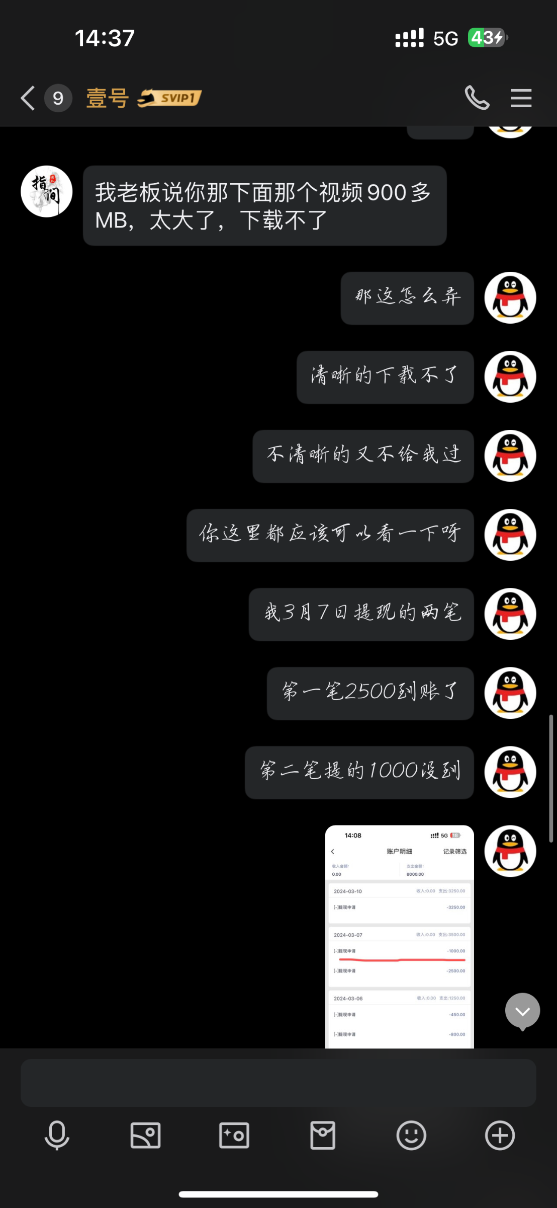 3月7号9点38提现的到现在3月13号都处理不好这玩什么视频给他们提供了6-7个各种个样的视频一个都不给过用14pm录制的视频和我讲内存太大了下载不了用其他手机录的又说看不清楚叫我重录真的搞笑啊这些人