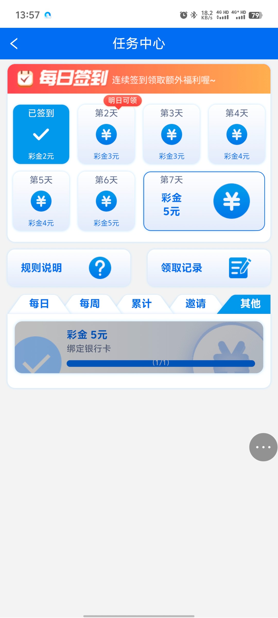 注册签到领2 绑卡在任务栏领5