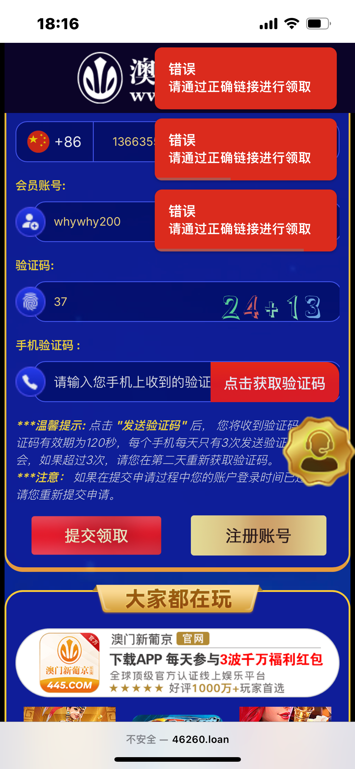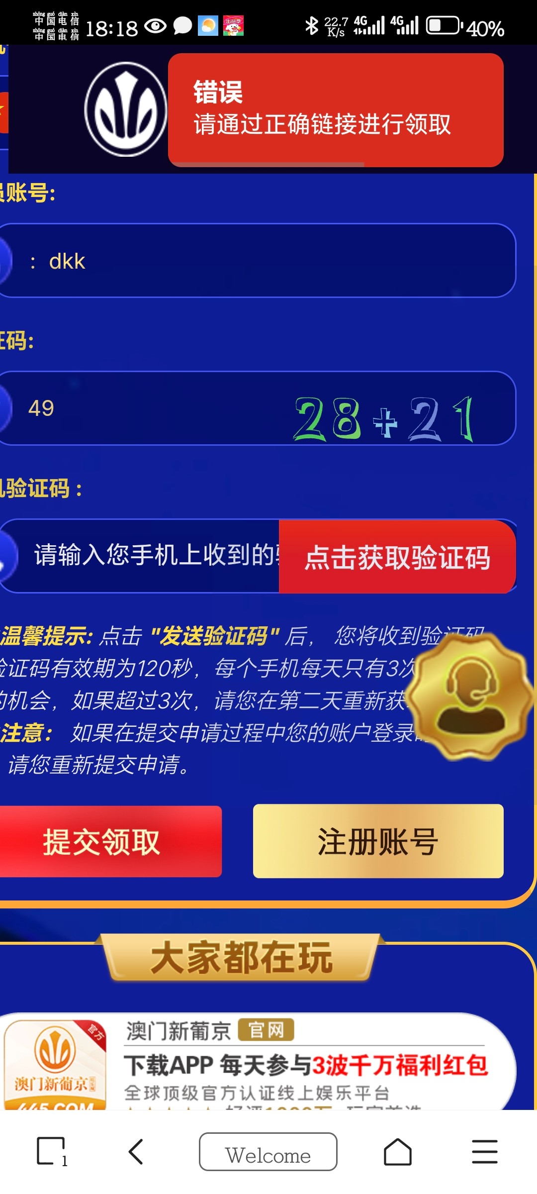 发验证码提示通过正确链接领取,要么就是注册过账号要么就是手机号不是特邀,手机号是特邀的能发验证码