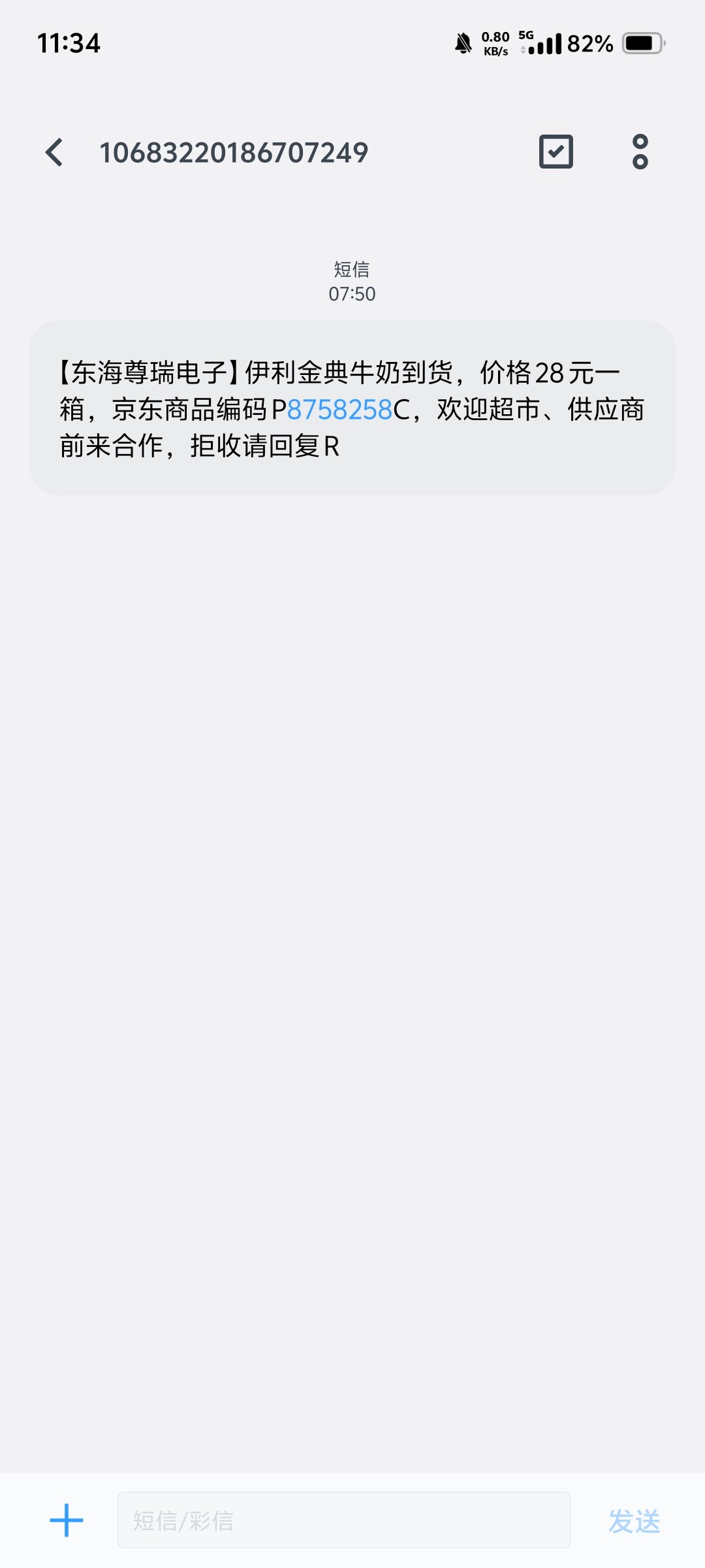 收到短信送28 没收到短信自己拿社区短信制作软件作图碰瓷 yl899.vip 10683220186707249 【东海尊瑞电子】伊利金典牛奶到货,价格28元一箱,京东商品编码P8758258C,欢迎超市、供应商前来合作,拒收请回复R