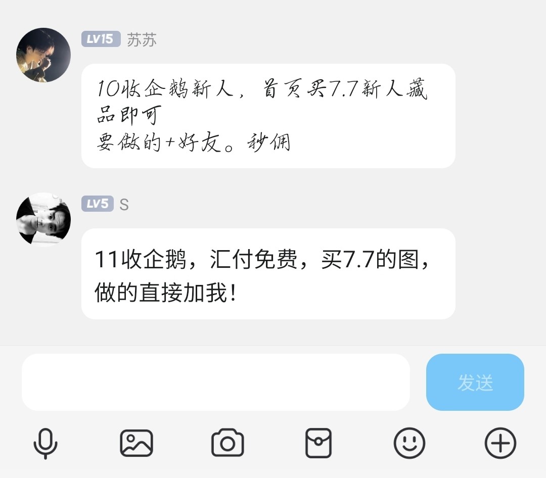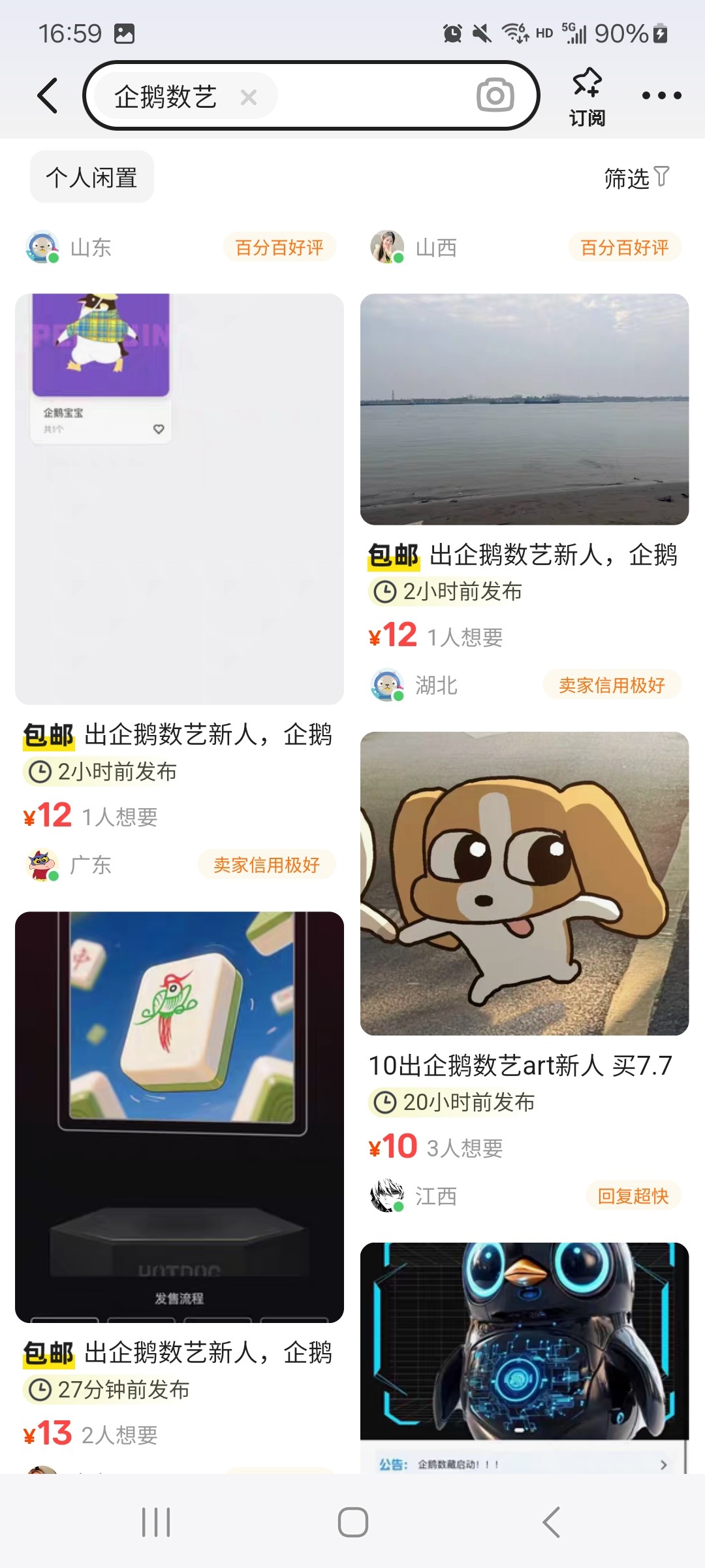 咸鱼挂10到12左右,需要成本7.7,赚三块加一张图片,图片看到十块,图片能卖的时候我会在帖子留言。咸鱼挂单模板如下直接拿去复制“出企鹅数艺新用户,实名开钱包并购买7.7新人图片”