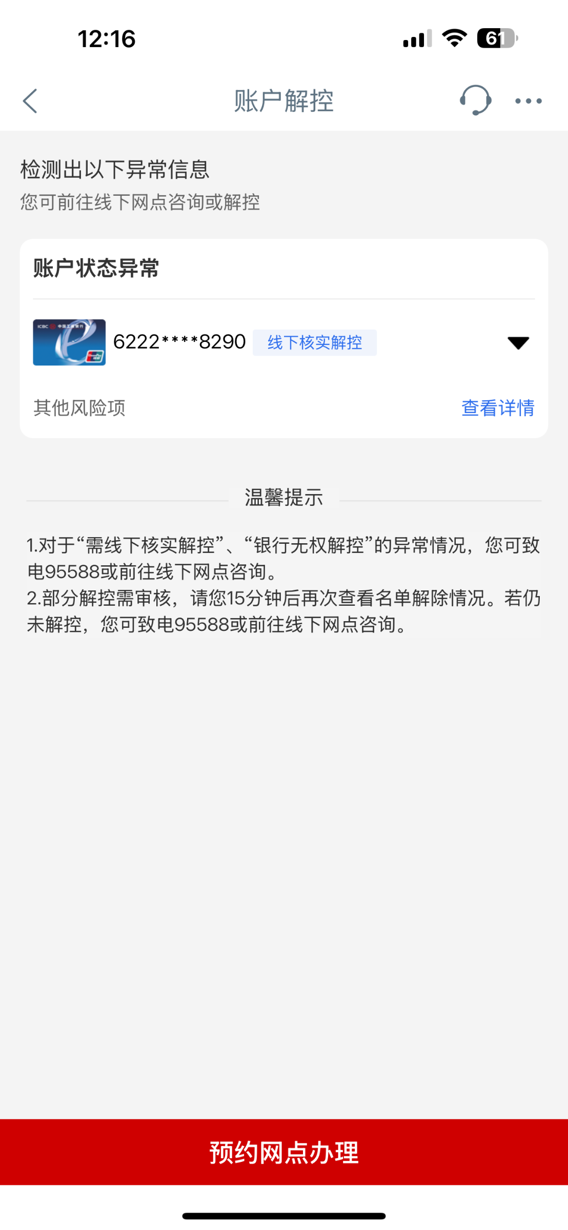 我前几天也是的,收工资就非柜了,提交了自助,第一次解告诉我网点解,他们后台没权限,因为身份证过期就没去,然后他办理进度那里会显示审核失败,然后再提交一次就秒解了,没去网点。