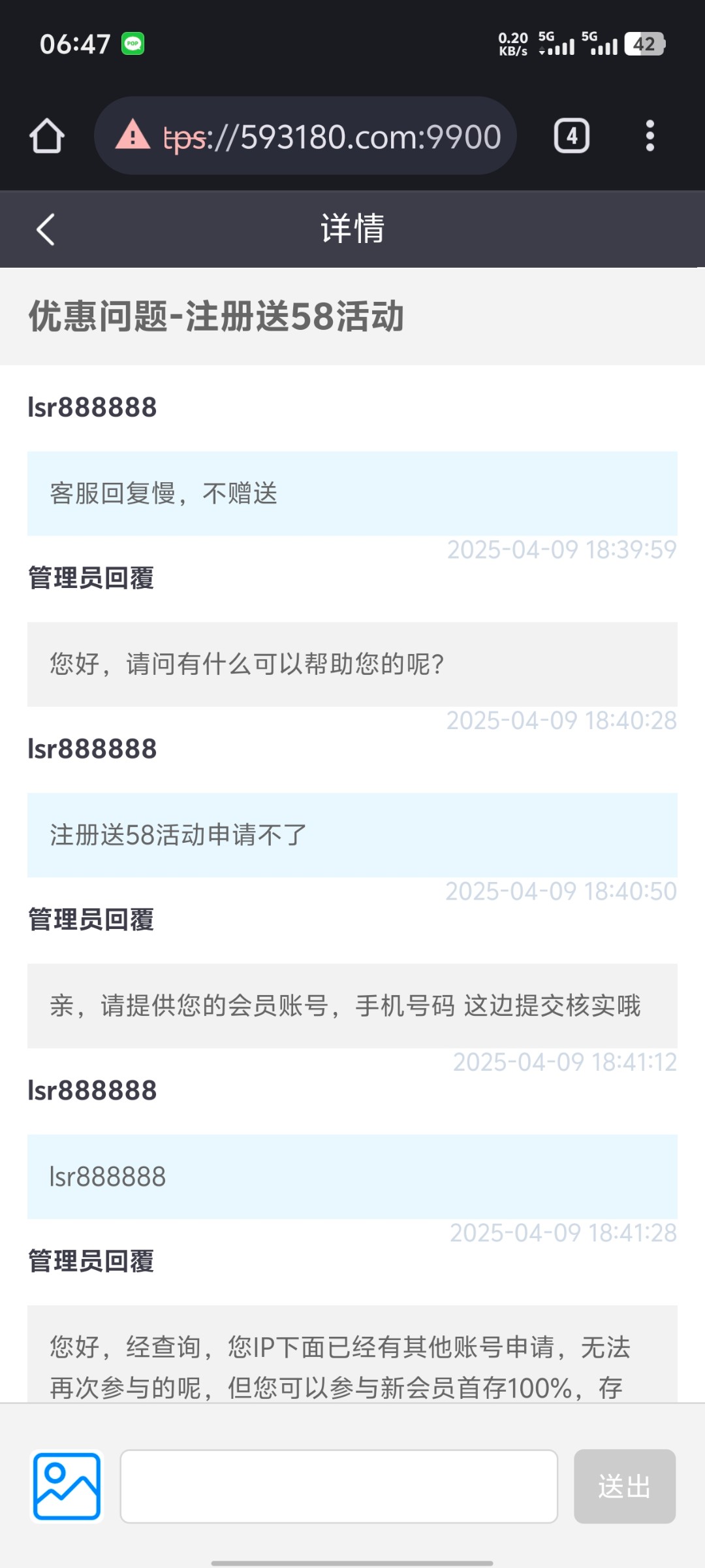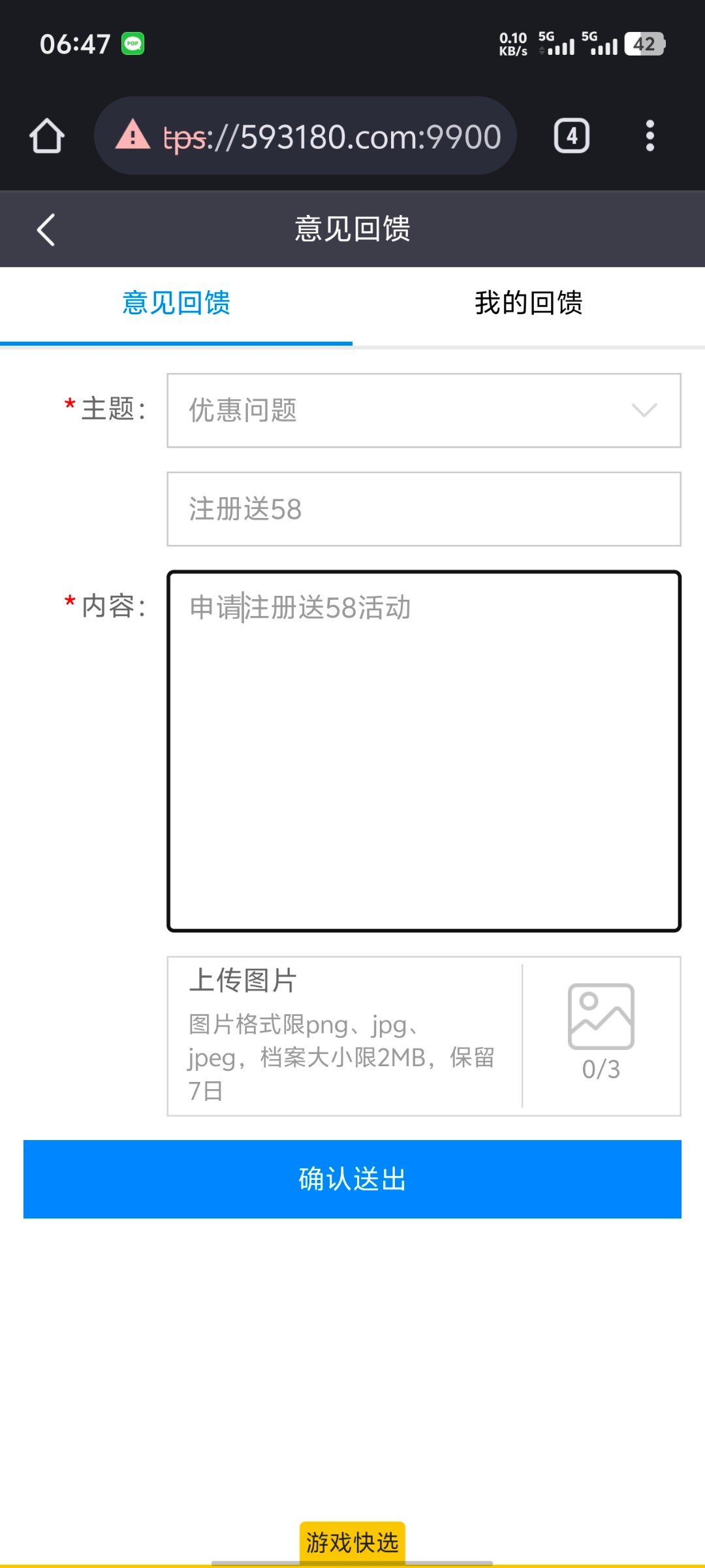 教大家怎么快速去申请,直接到意见反馈,优惠问题,然后说回复慢申请不了,管理员会一分钟内回复,然后提供你的账号手机号就可以查询了,我开加速器进去说IP领取过不给送