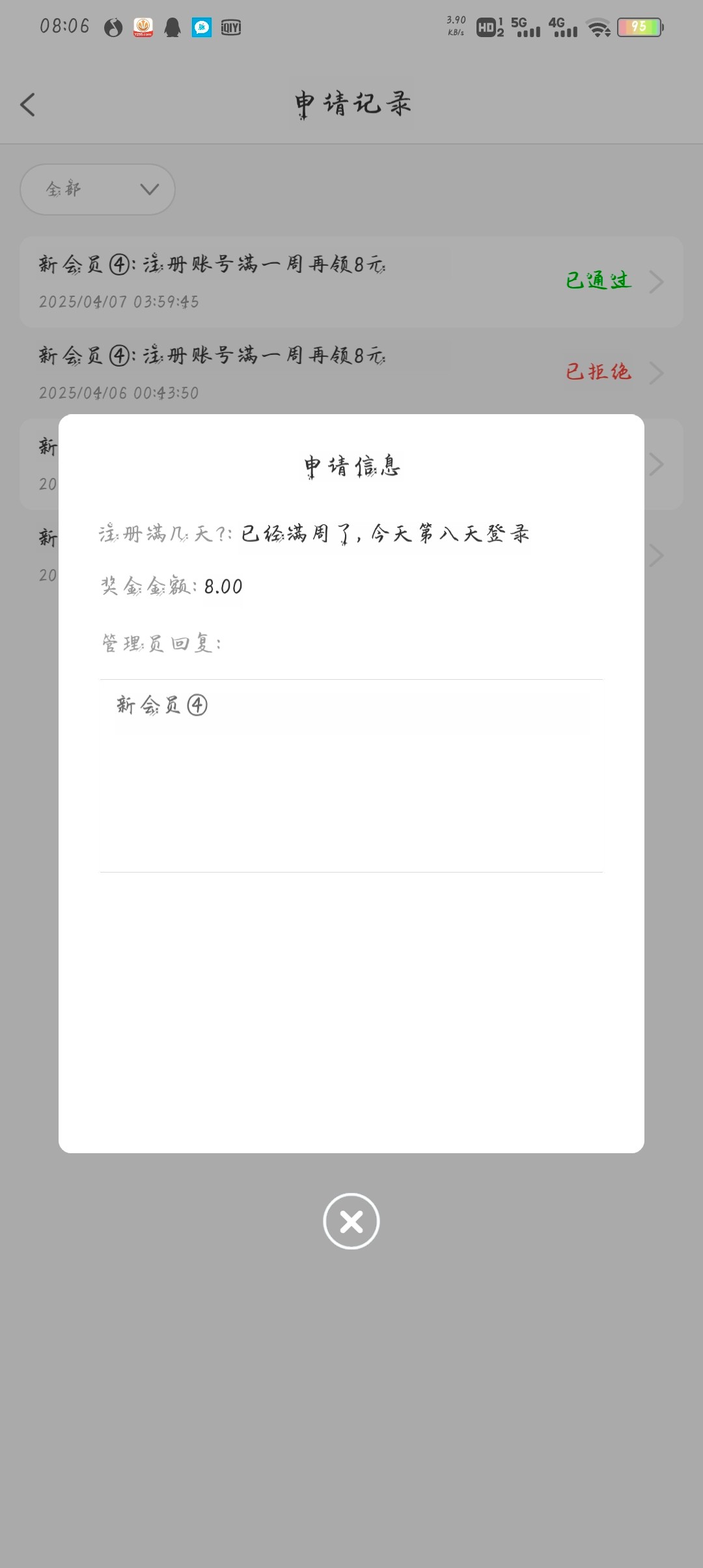 注册满周后,第八天登录上去新人优惠里面申请,我是之前申请到了,忘记发了 7255.com