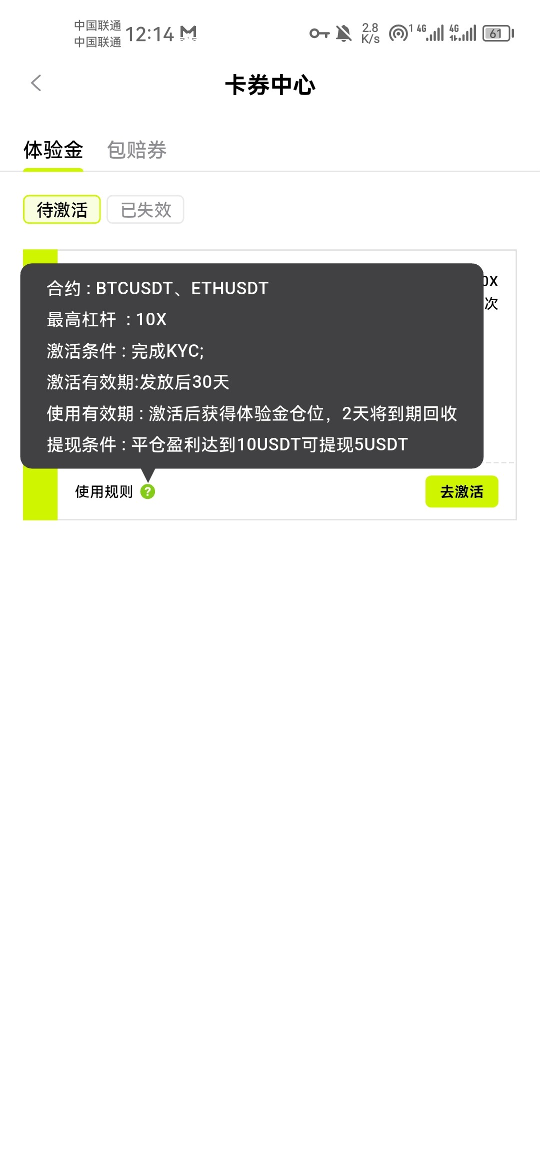 体验金到了,首页大使计划这里点进去,显示已领取点进去卡券中心激活,然后开合约,能不能打出来看造化,审核过一下。