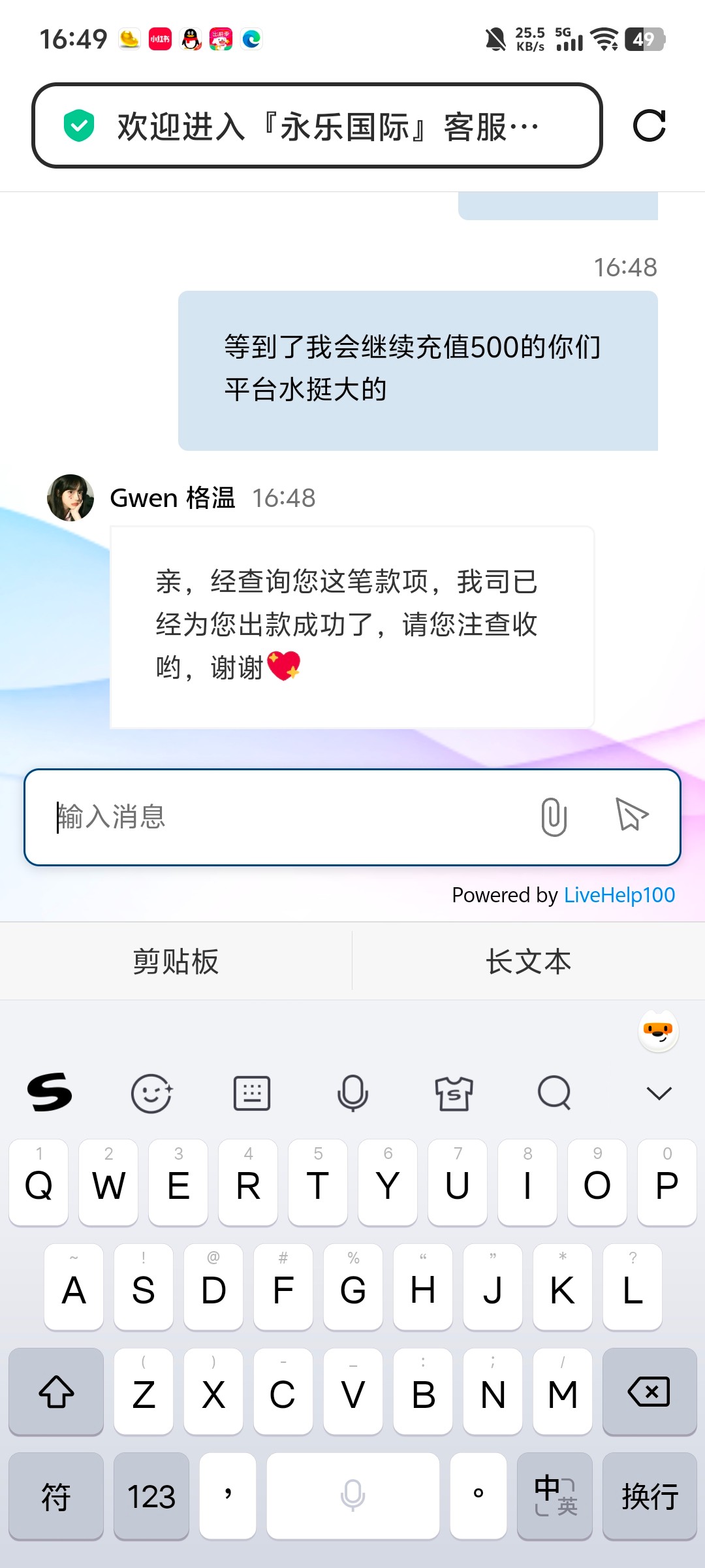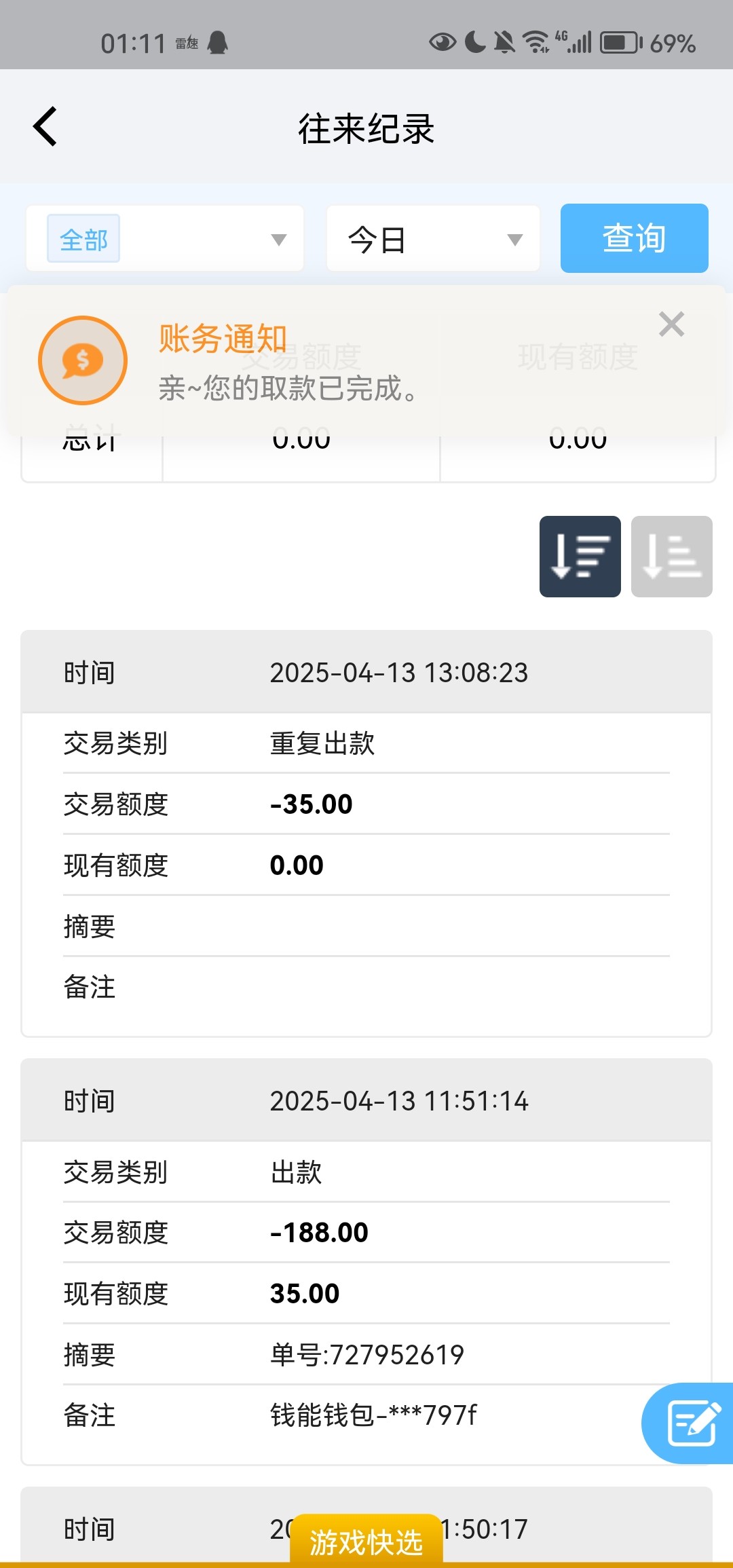 事情是这样的,刚才老哥发了永乐629发短信送29,只能提款188,然后进电子几分钟爆了200多,就去出款,然后一直不到,就去论坛搜了一下永乐629,好家伙,全是不出款的,这下基本上就没有抱希望了,11点50申请出款的,一直不到,本着死马当着活马医就去找了客服,假装问没啥没有到,我还想着去充值玩,反正一通忽悠客服,然后客服说马上给你办理取款,扣除多的盈利,然后就秒到了