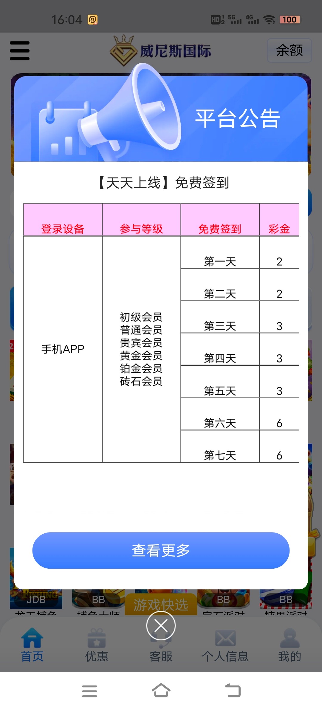 之前充值过威尼斯国际,符合图片上vip等级的,从周一到周日分别签到领(2+2+3+3+3+6+6),他这个现在是每周都有的,重复循环。我每周都能打出来一次,之前也发过帖子这周第一天领了2元最高打到380,后来太贪还剩269提的。网址67800.com有打不开网页的,可以论坛搜索其他老哥发的威尼斯国际的网址他这个提现秒到的