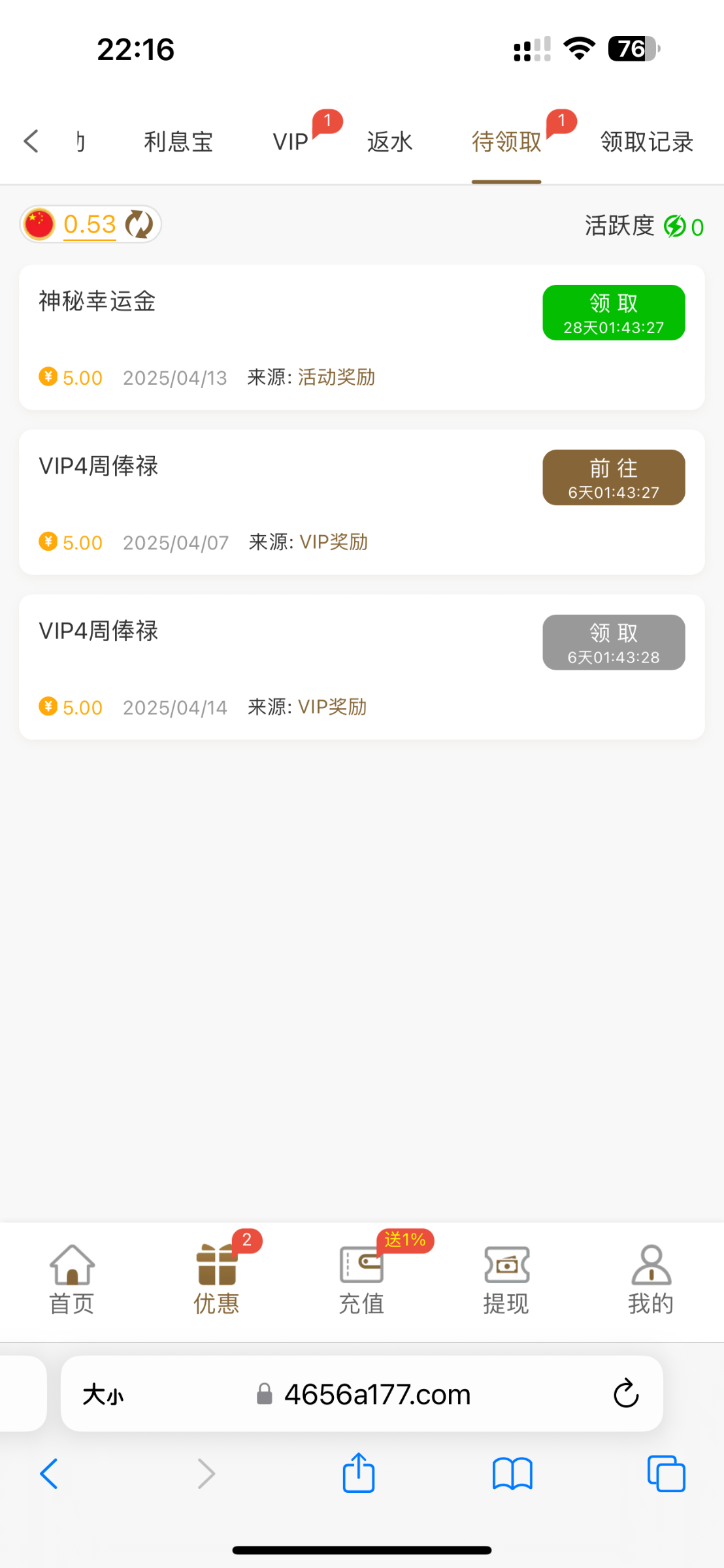 有号的上去看看有幸运礼金5r这平台我v4才给这点充了十几个福利太少了 网站4656.com