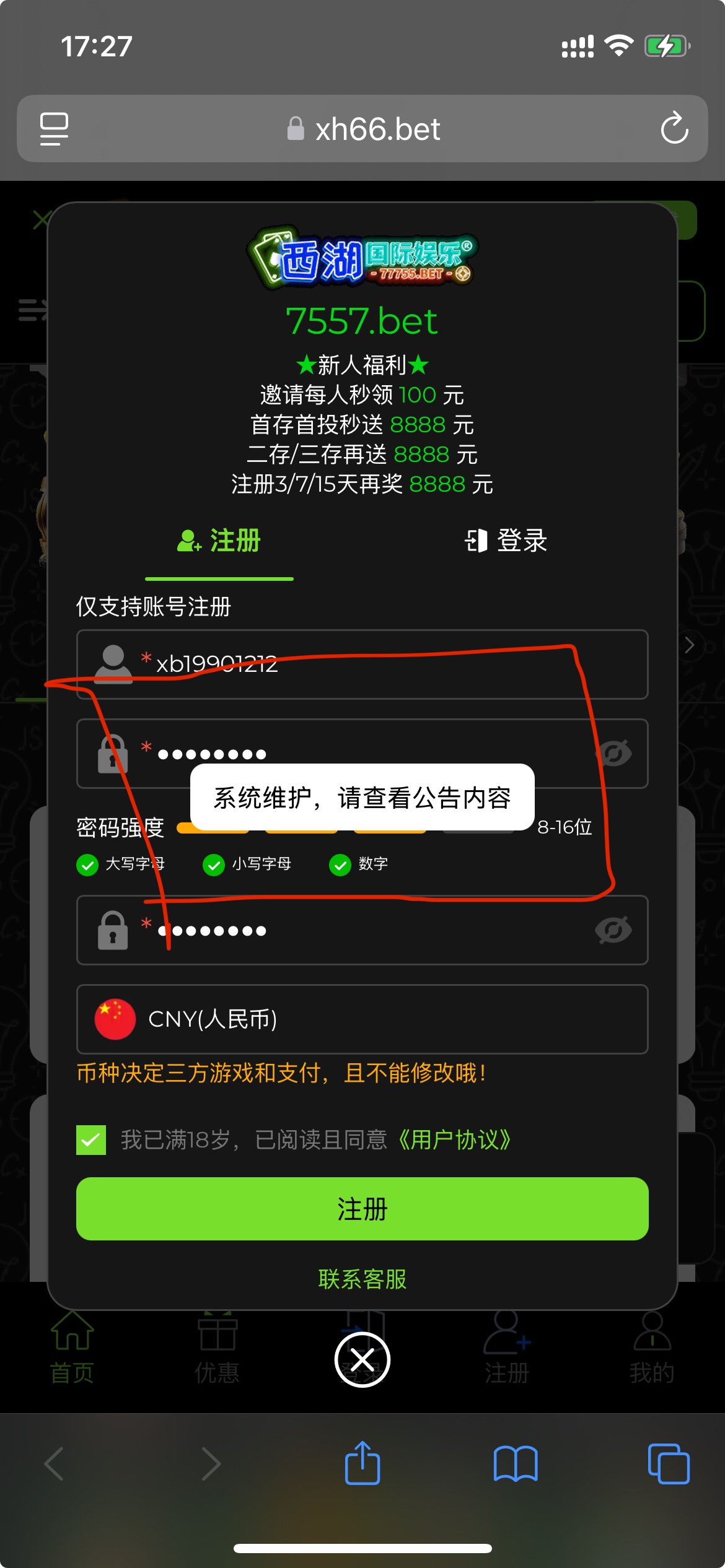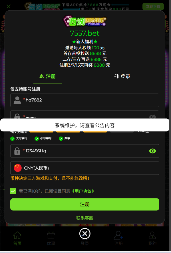 系统维护了,注册不了
