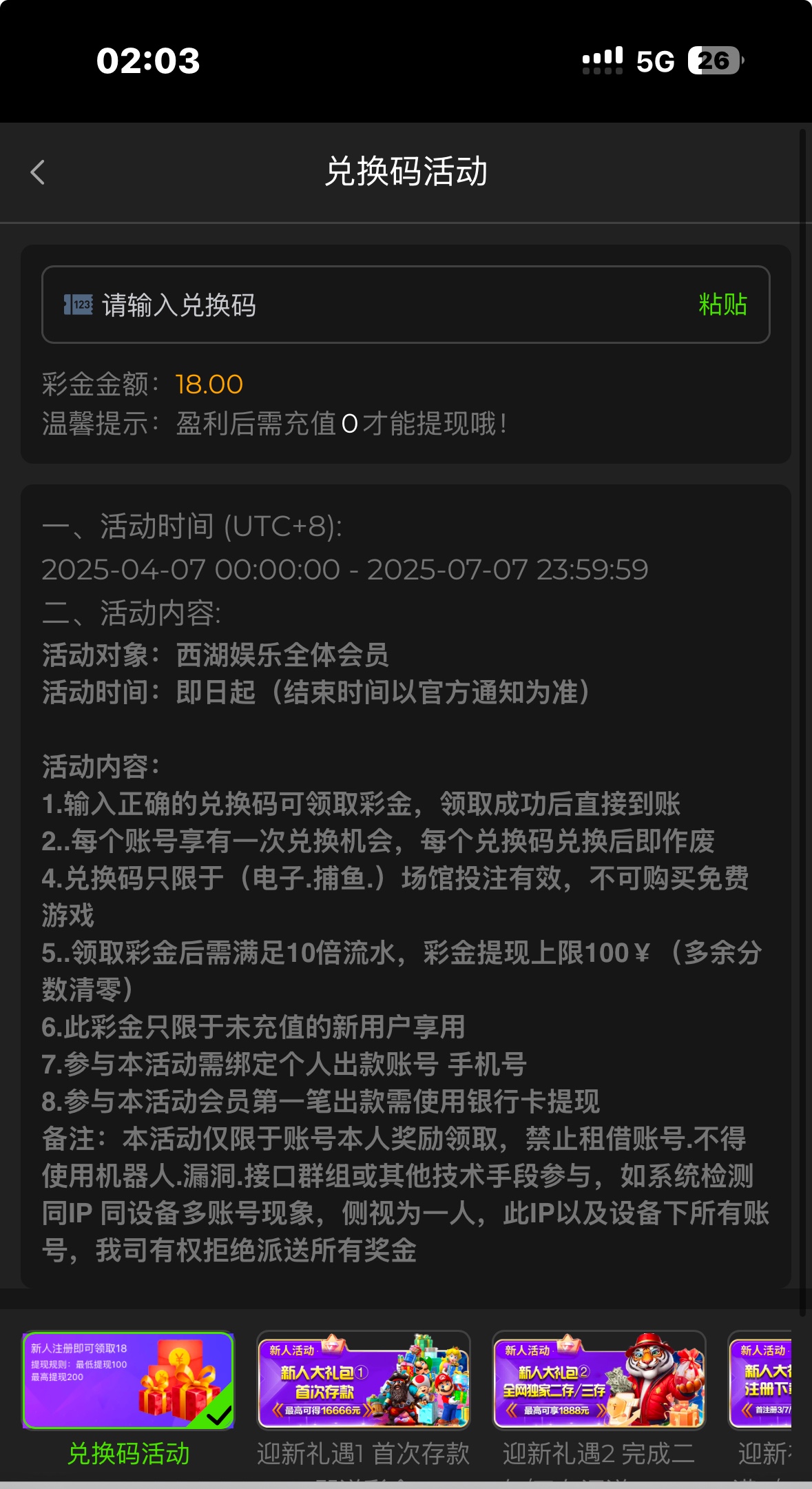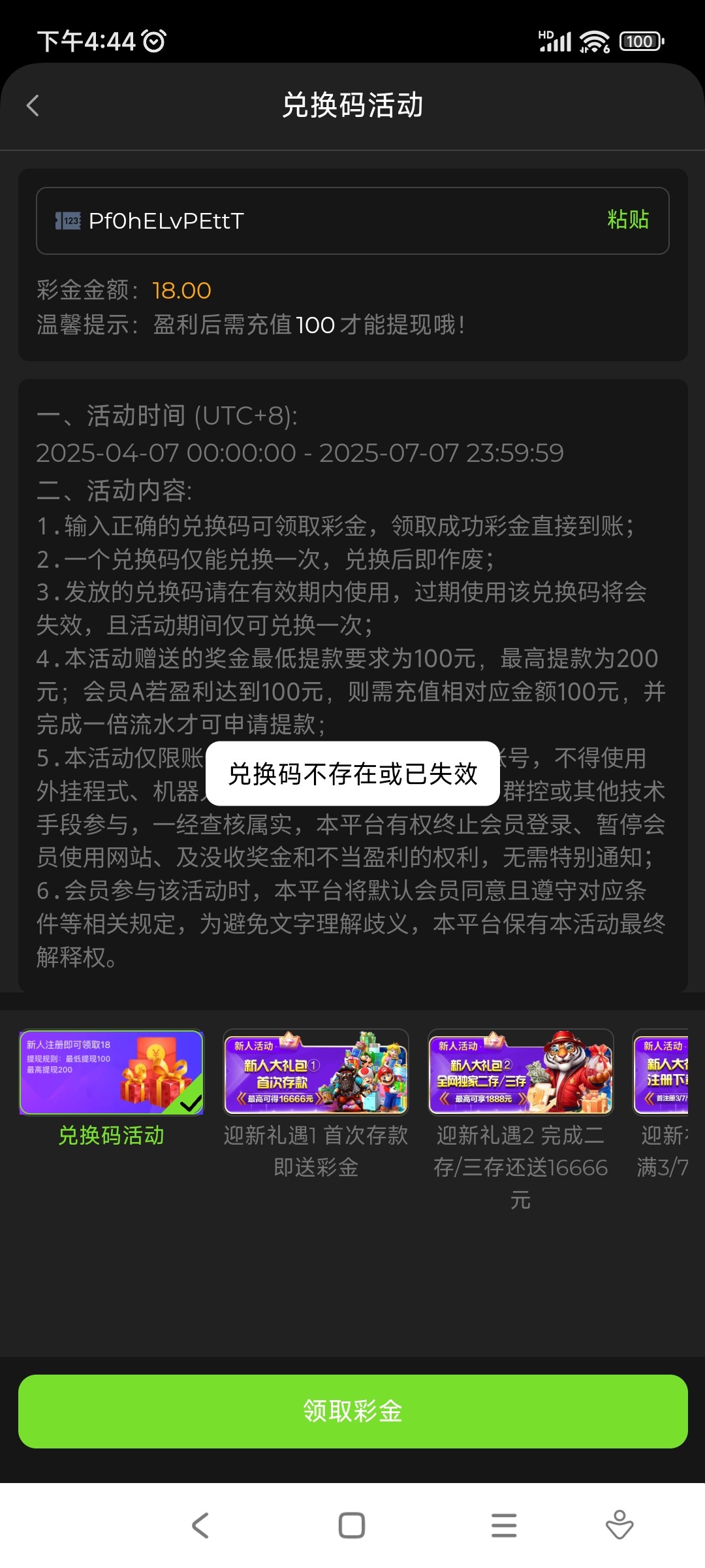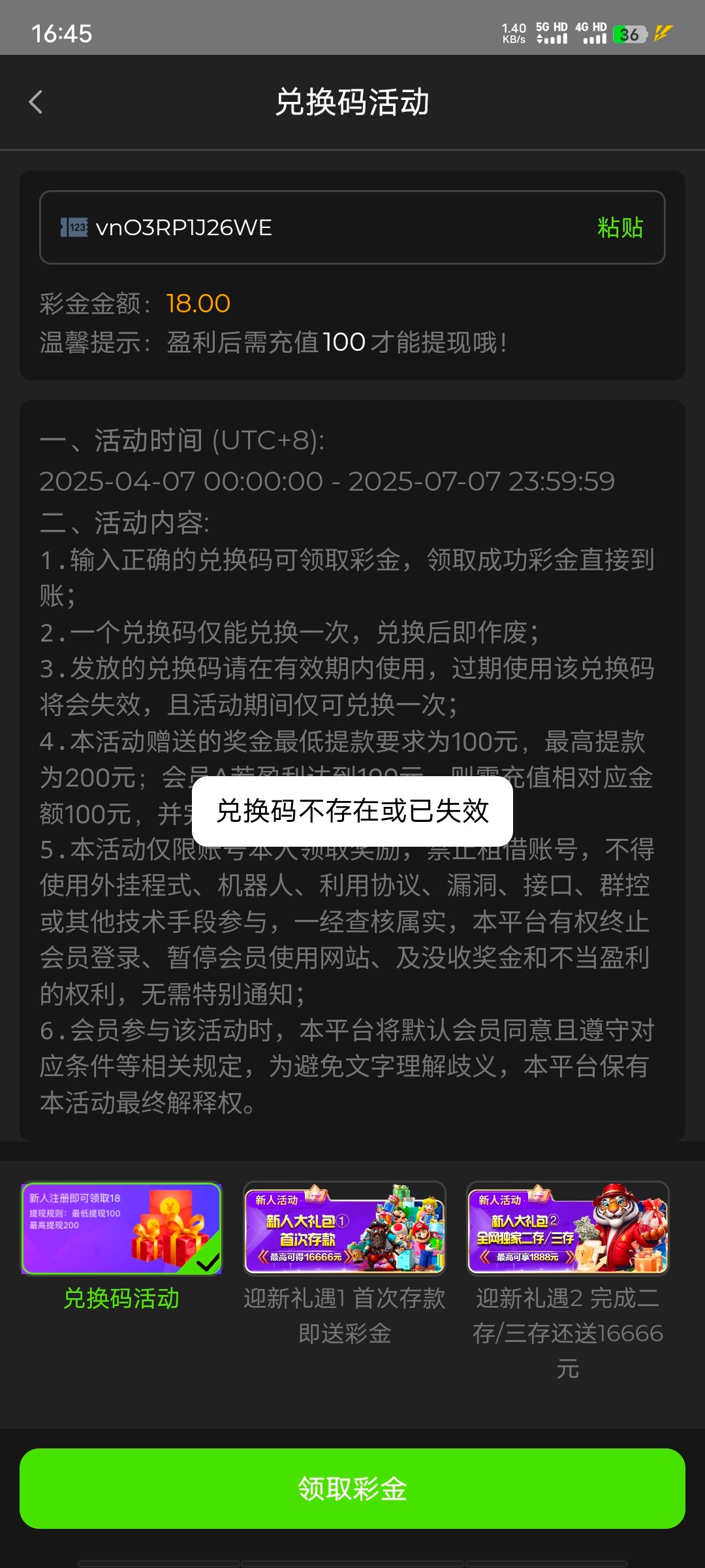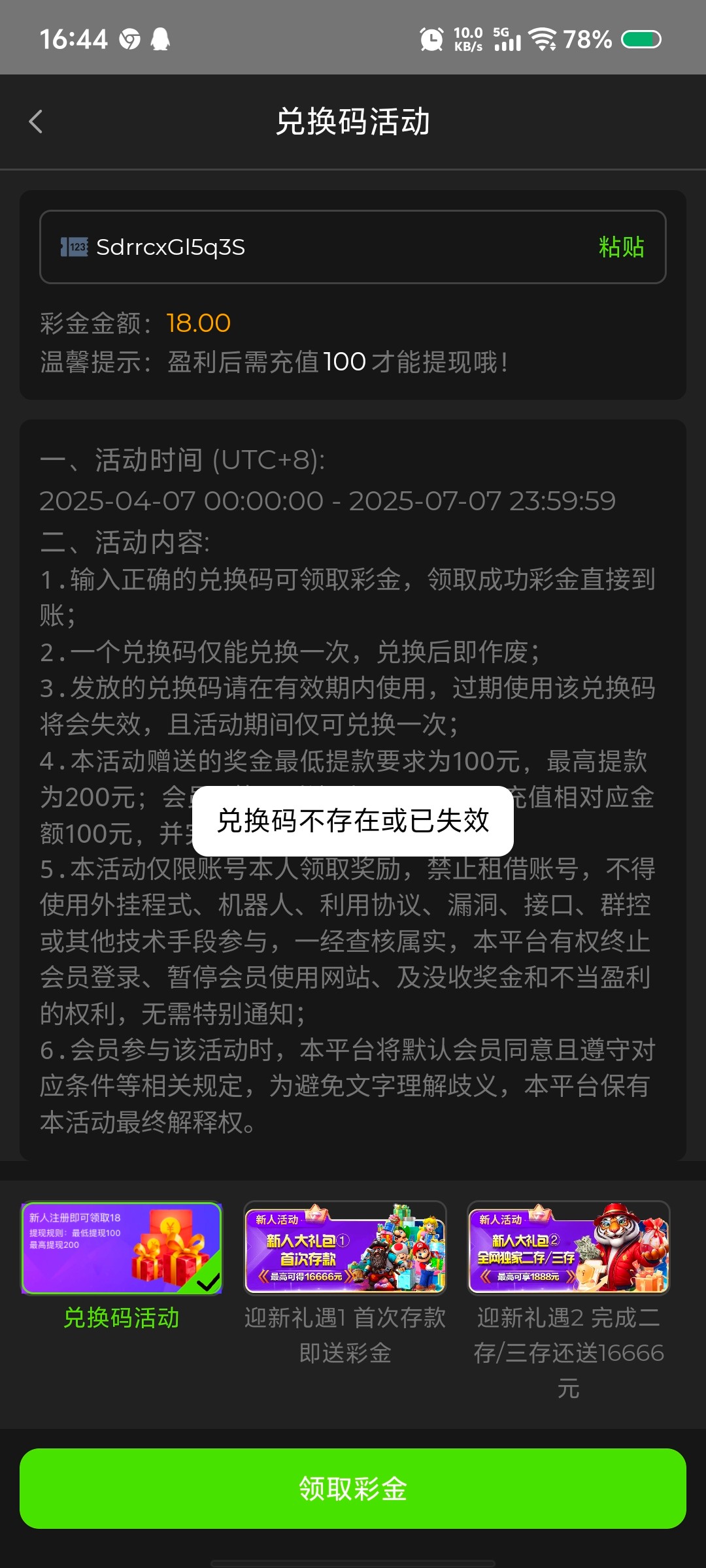 我兑换到的彩金码是用过的