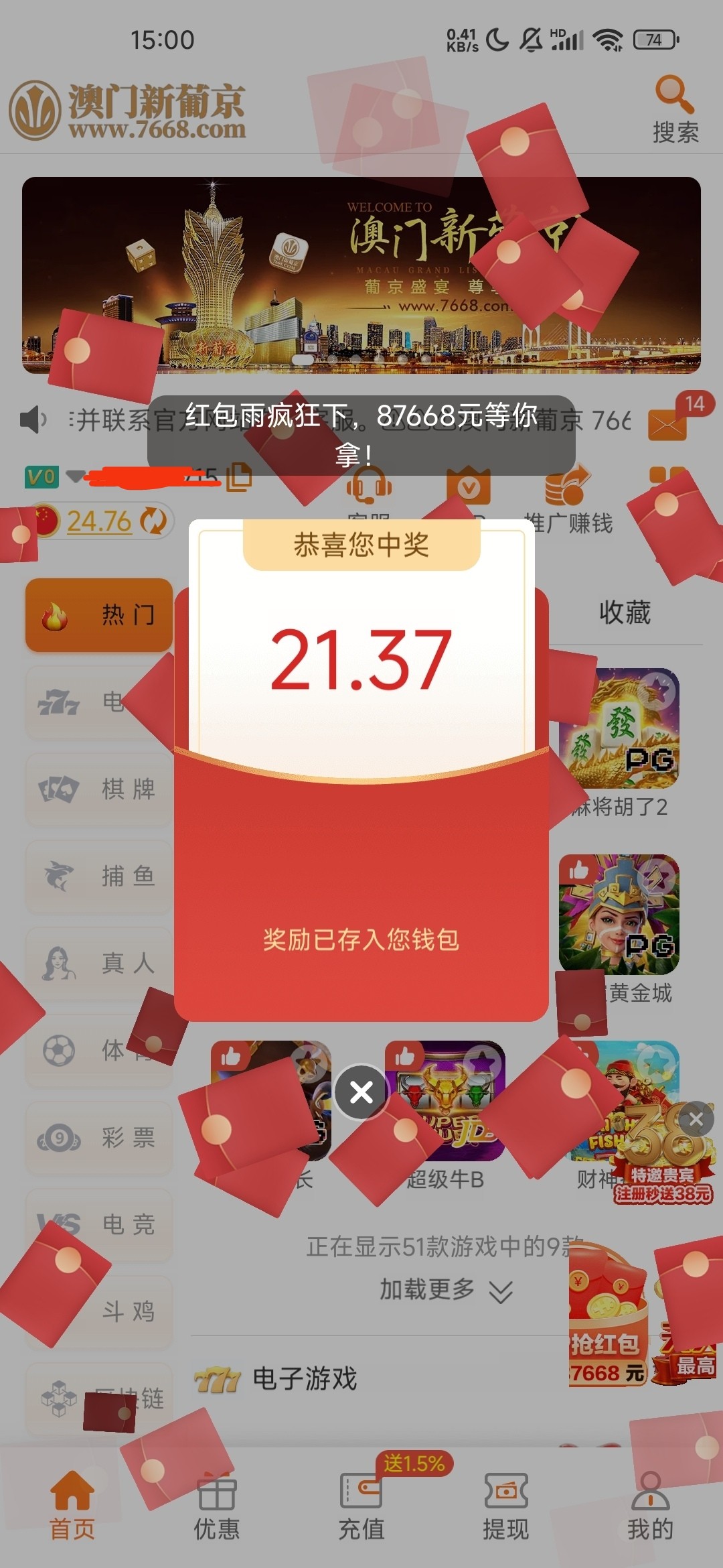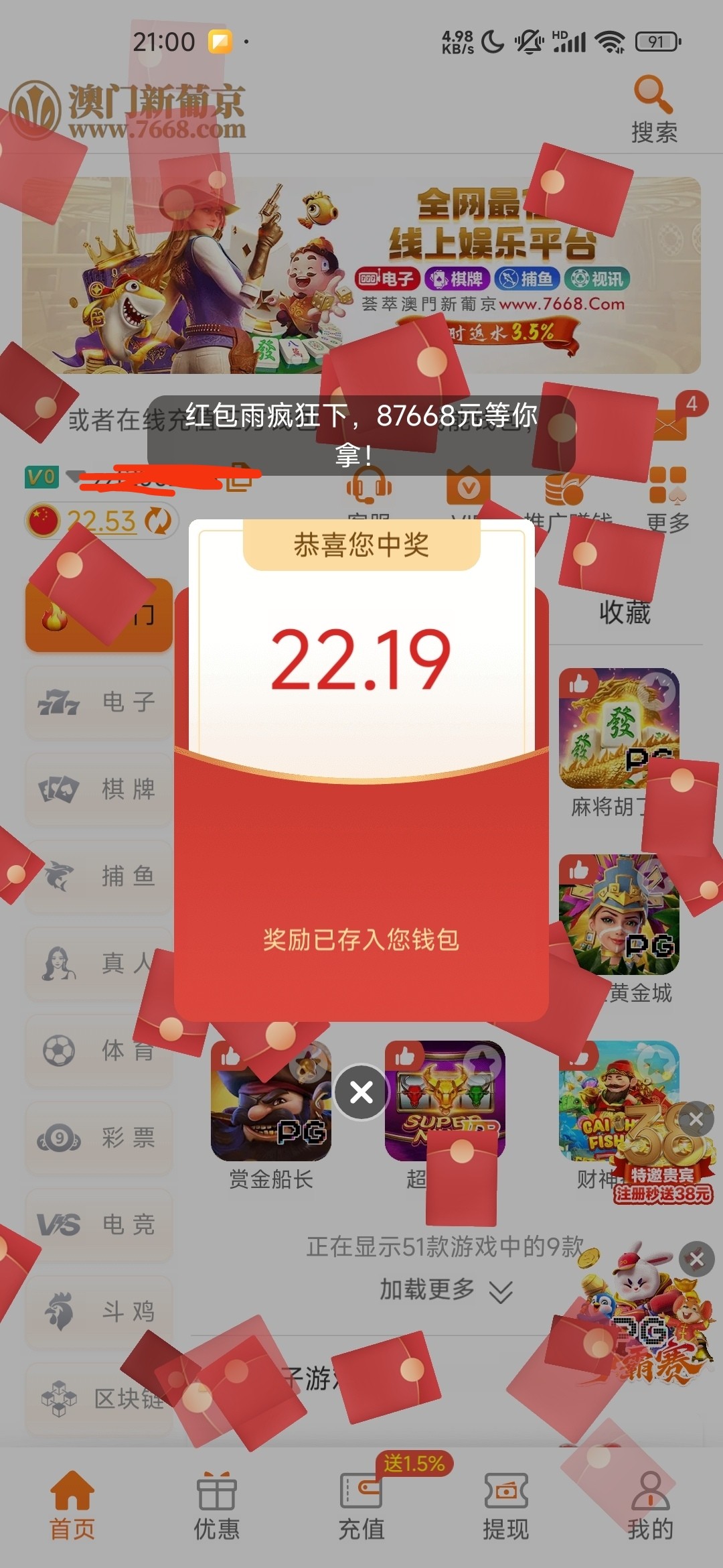 昨天晚上抢了个22 刚刚又抢了个21每次卡整点抢感觉都还可以 过一分都是一块了 我充过四五百不知道没充值的能不能抢 我直接就能提现 充值低于五次或者小于一百 要打到一百 才能提现7668.com
