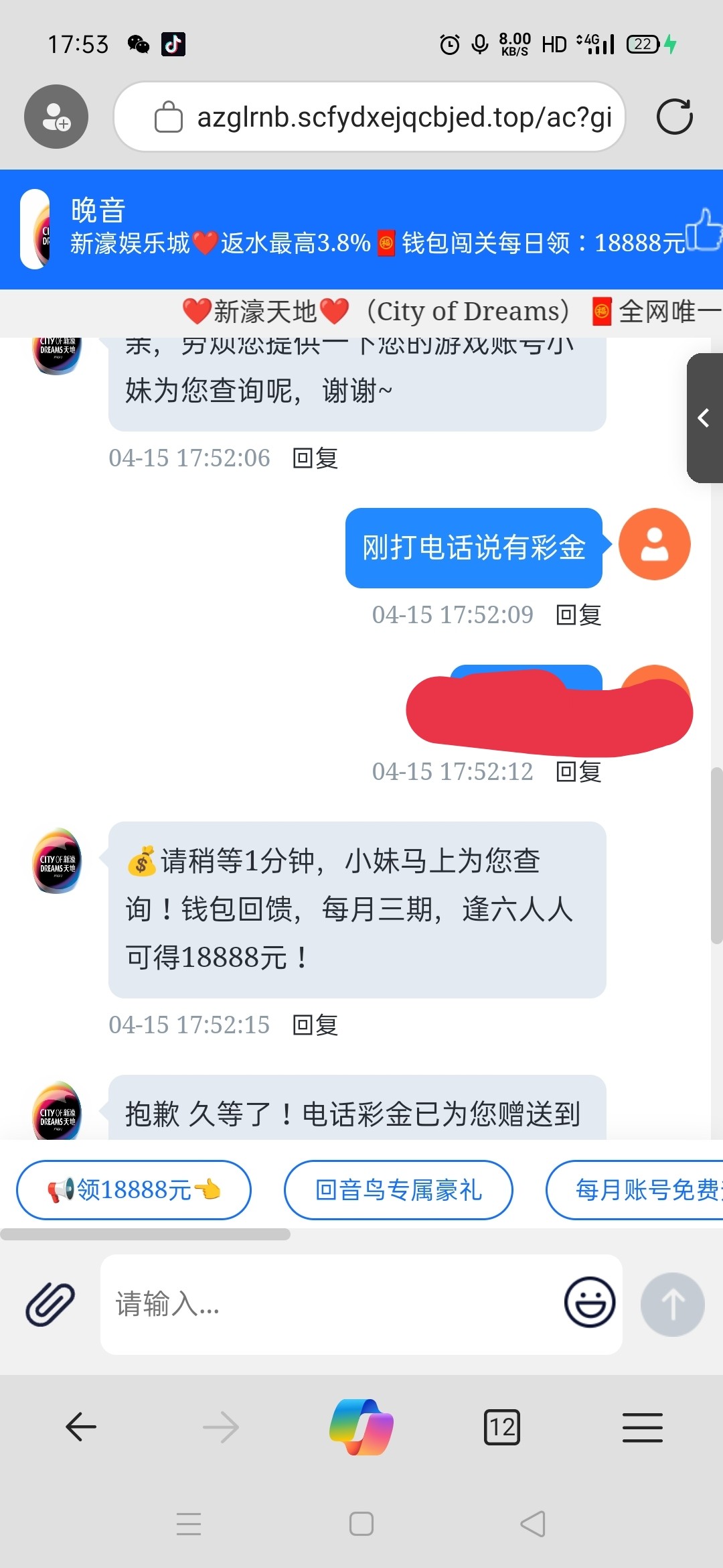 找在线客服说领电话彩金 可以自制图去碰 地址 9725.com